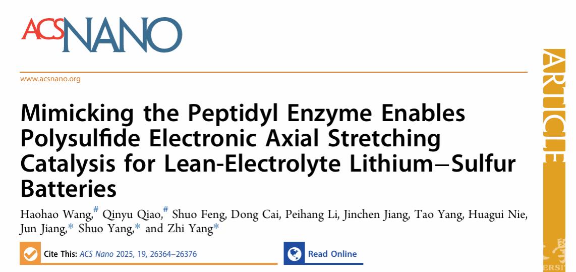 该工作以“Mimicking the Peptidyl Enzyme Enables Polysulfide Electronic Axial Stretching Catalysis for Lean-Electrolyte Lithium-Sulfur Batteries”为题发表于国际顶级期刊《ACS Nano》(IF=16.0)。九州网页版_九州(中国)作为第一通讯单位,我校电气与电子工程学院2021级硕士研究生王浩浩为第一作者,中国科技大学硕士研究生乔钦宇为共同第一作者,我校化学与材料工程学院杨植教授、电气与电子工程学院杨硕副教授、中国科技大学江俊教授为本文通讯作者,我校聂华贵教授、蔡冬副教授、硕士研究生李佩航、蒋金晨、杨涛同学以及中国科技大学冯硕博士参与了这项工作。
