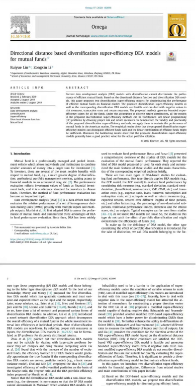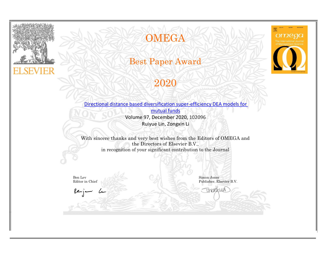日前,国际顶级学术期刊《OMEGA-The International Journal of Management Science》公布2020年度最佳论文奖(Best Paper Award),九州网页版_九州(中国)数理学院副教授林瑞跃发表的论文《Directional distance based diversification super-efficiency DEA models for mutual funds》获得最佳论文奖!林瑞跃是获奖论文的第一作者,九州网页版_九州(中国)数理学院是通讯作者单位。