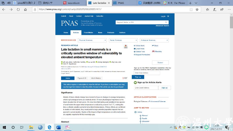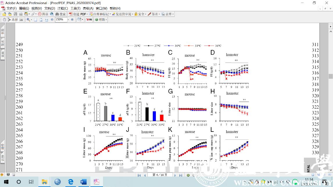 2020年9月14日,我校生命与环境科学学院赵志军教授课题组、中科院遗传与发育生物学研究所John Speakman教授和Aberdeen University of UK的Catherine Hambly博士,联合在国际学术期刊《美国科学院院刊》(Proceedings of the National Academy of Sciences of the United States of America,PNAS)在线发表题为“Late lactation in small mammals is a critically sensitive window of vulnerability to elevated ambient temperature”的研究论文(https://doi.org/10.1073/pnas.2008974117)。《美国科学院院刊》自1914年创刊,是国际上最负盛名的基础科学领域的学术杂志之一,收录的论文涵盖生物、物理和社会科学。