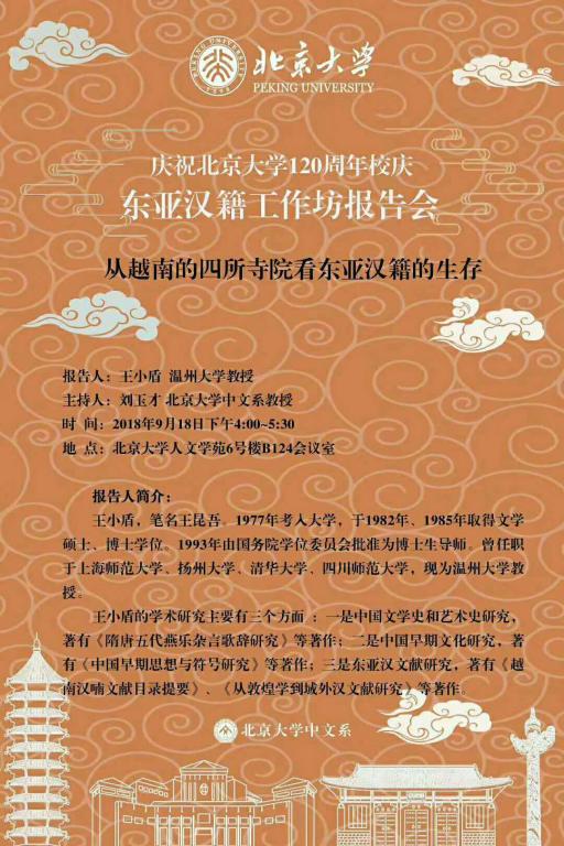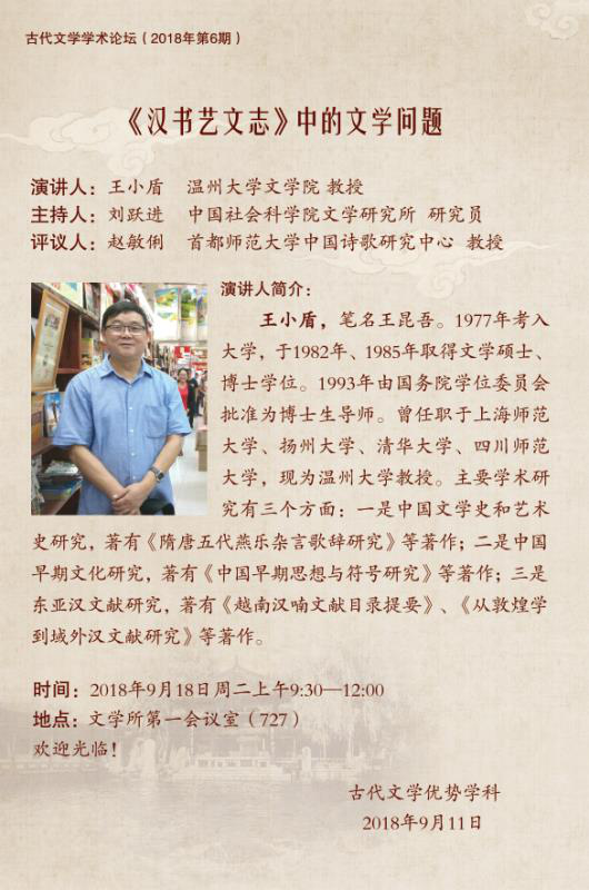 9月18日上午,九州网页版_九州(中国)特聘教授王小盾在中国社会科学院文学所第一会议室主讲古代文学学术论坛第6期 《<汉书艺文志>中的文学问题》。下午,王小盾教授在北京大学人文学苑6号楼B124会议室作题为《从越南的四所寺院看东亚汉籍的生存》的主题报告。晚上,中国红楼梦学会常务理事饶道庆教授在北京的恭王府开讲《“正邪两赋”话宝玉》,这是北京青年报"青睐"线下活动携手恭王府举办"走进红楼梦中人——恭王府与《红楼梦》“主题系列讲座的第四场。