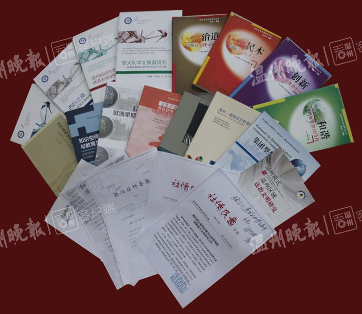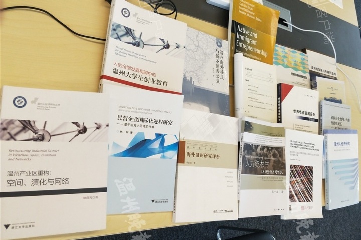 在世界温州人中心里面,有几个书架,里面摆满了世界温州人研究中心专家们的研究成果和学术著作。里面涉及到温州人移民、温商产生和发展、海外温州人和温州本地关系研究、温州模式、温州地方法治建设、温州民企与国际交流等方方面面的问题。