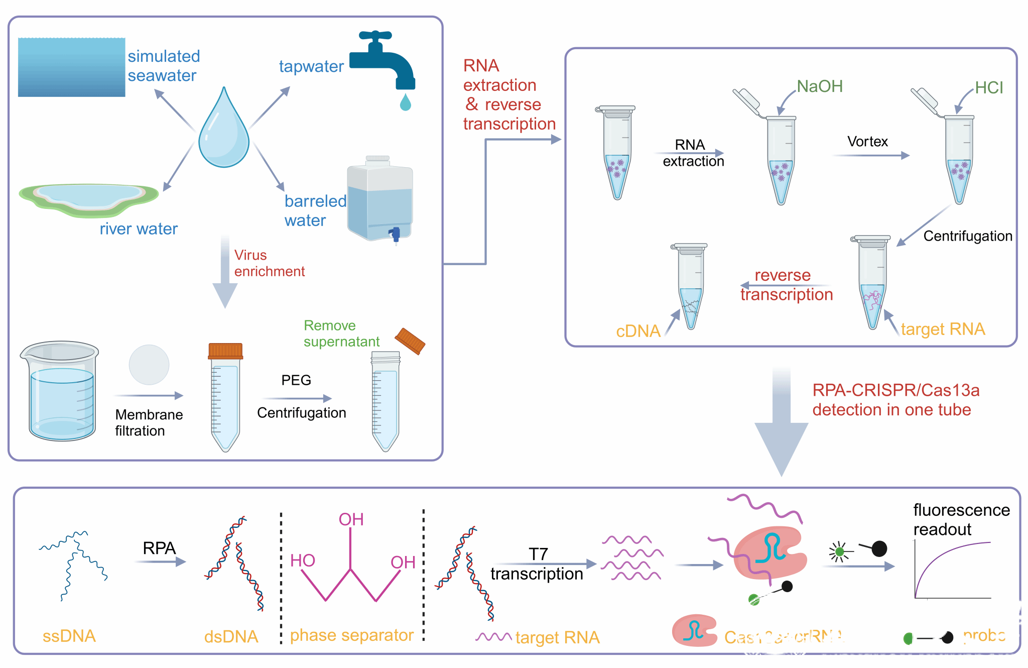 九州网页版_九州(中国)生命与环境科学学院吴明江教授团队结合自身优势开展环境毒理和病原检测等交叉研究,取得了系列研究成果。近日,苏来金教授课题组在环境领域著名学术期刊Environmental International杂志上(SCI一区TOP 期刊,IF=10.3)发表了题为“CRISPR/Cas13a combined with reverse transcription and RPA for NoV GⅡ.4 monitoring in water environments”的研究性论文。该论文基于重组酶聚合酶扩增技术(RPA)和CRISPR/Cas13a系统,建立了一种适用于多种水环境、准确可靠、简便快速的GⅡ.4型诺如病毒定量检测方法,该方法在复杂水环境和资源有限地区的诺如病毒快速检测表现出巨大的应用潜力。