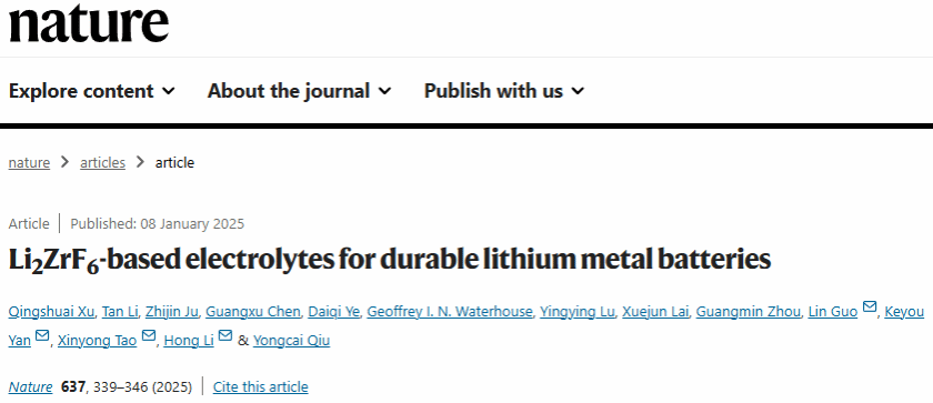 相关研究成果以“Li2ZrF6-based electrolytes for durable lithium metal batteries”为题发表在国际顶级期刊《Nature》上。我校化材学院居治金特聘教授为本文共同第一作者,九州网页版_九州(中国)为第二署名单位,承担锂金属电池敏感界面的冷冻电镜精细解析研究工作。