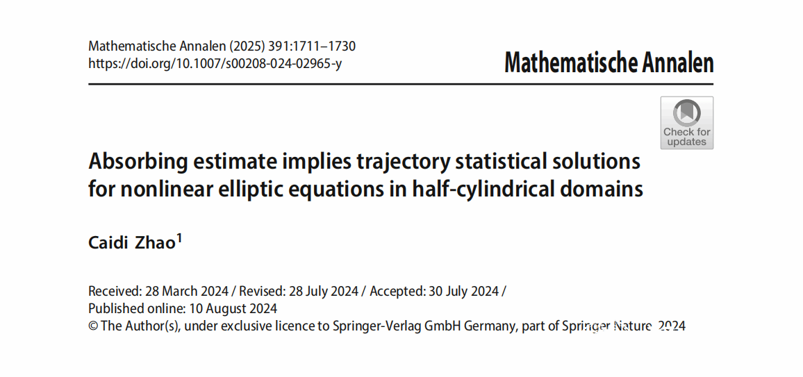 我校数理学院赵才地教授在国际数学顶刊《Mathematische Annalen》(德国数学年刊)上发表题为《Absorbing estimate implies trajectory statistical solutions for nonlinear elliptic equations in half-cylindrical domains》(半柱体区域上非线性椭圆方程组的吸收估计蕴含轨道统计解)的学术论文。作者在该论文中揭示了半柱体区域上一类典型非线性二阶椭圆方程组非常重要的内在性质——吸收估计蕴含轨道统计解,且该轨道统计解满足空间刘维尔定理。论文基于无穷维动力系统理论方法和黎斯表示定理,为椭圆偏微分方程解的统计性质研究开拓了新的研究方法。赵才地教授为论文唯一作者,九州网页版_九州(中国)为唯一单位,相关工作受到国家自然科学基金和浙江省自然科学基金(重点项目)的资助。