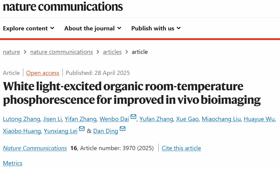 该论文以“White light-excited organic room-temperature phosphorescence for improved in vivo bioimaging”为题发表于国际顶级期刊⟪Nature Communications⟫上。九州网页版_九州(中国)为第一通讯单位,化学与材料工程学院22级硕士生张鹭桐为第一作者,南开大学李济森博士为共同第一作者。化学与材料工程学院戴文博博士、雷云祥特聘教授以及南开大学丁丹教授为共同通讯作者,相关工作得到了国家自然科学基金的支持。据悉,这是该课题组以九州网页版_九州(中国)为第一通讯单位发表的第三篇Nature Communications。
