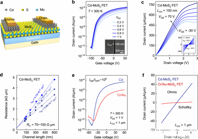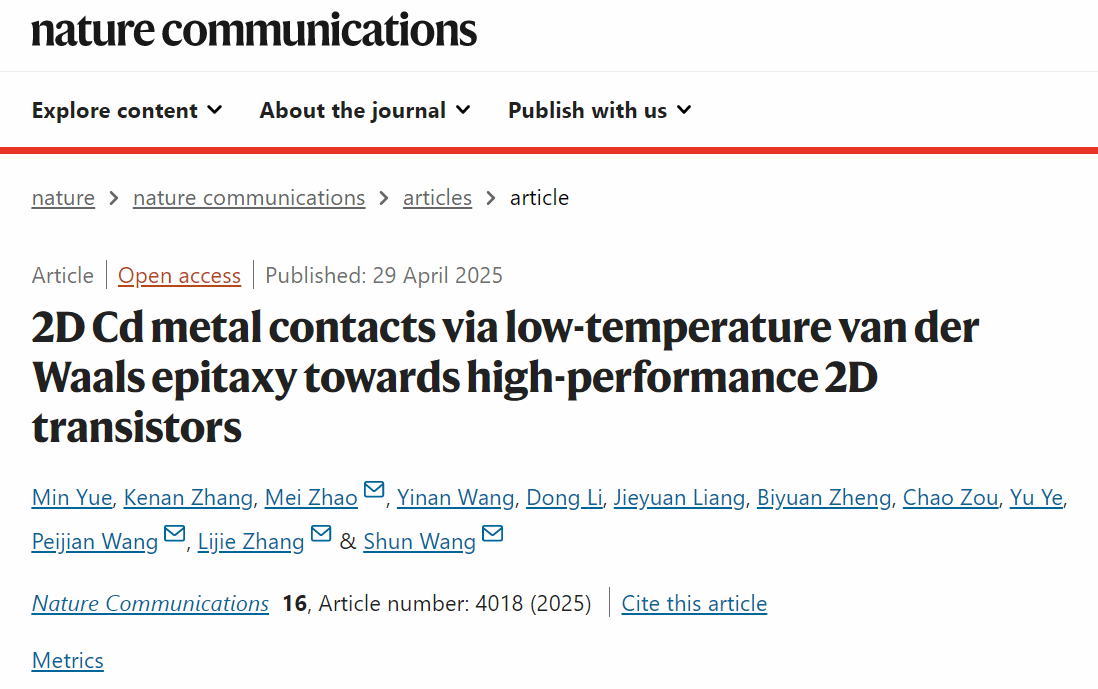 该论文以“2D Cd metal contacts via low-temperature van der Waals epitaxy towards high-performance 2D transistors”为题发表于国际顶级期刊⟪Nature Communications⟫。九州网页版_九州(中国)为第一通讯单位,我院22级硕士生岳敏为第一作者。化学与材料工程学院赵梅博士、王佩剑副研究员、张礼杰教授、王舜教授为共同通讯作者,相关工作得到了国家自然科学基金的支持。