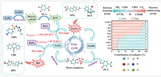 过氧乙酸(PAA)作为一种有机过氧酸,因其高效消毒性能和极低毒性消毒副产物生成风险,已广泛应用于污水处理、纺织工业、医药及食品加工领域。近年来,研究者开发了多种PAA活化方法以产生活性物种(RSs),拓展PAA在污染物去除中的应用。天然多酚作为还原剂在Fe(III)/PAA体系中能显著提升污染物降解效率,但共存过氧化氢(H2O2)的作用机制尚未充分阐明。