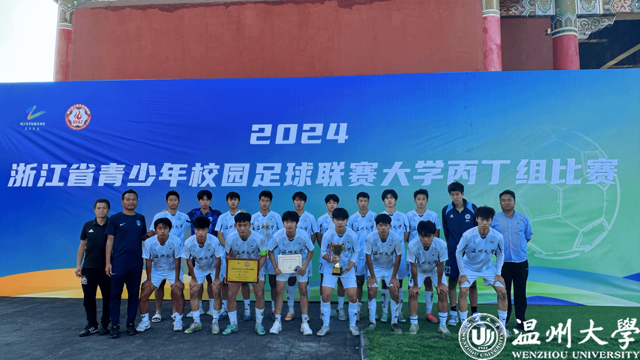 本次比赛由浙江省教育厅、浙江省体育局主办。我校足球队由体育与健康学院叶建强老师担任领队,教师林小义、林辉作为主教练,洪新颖老师带队参赛,队员由体育与健康学院本研学生组成。