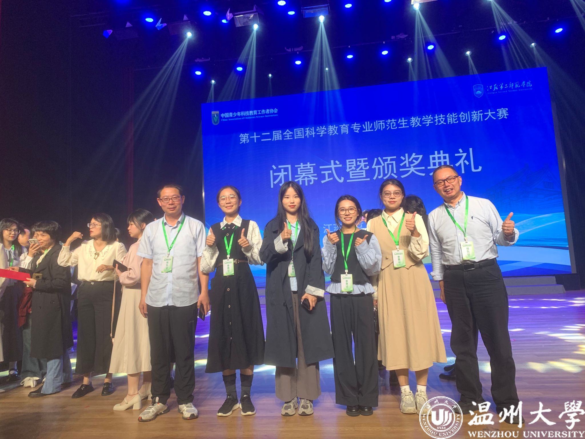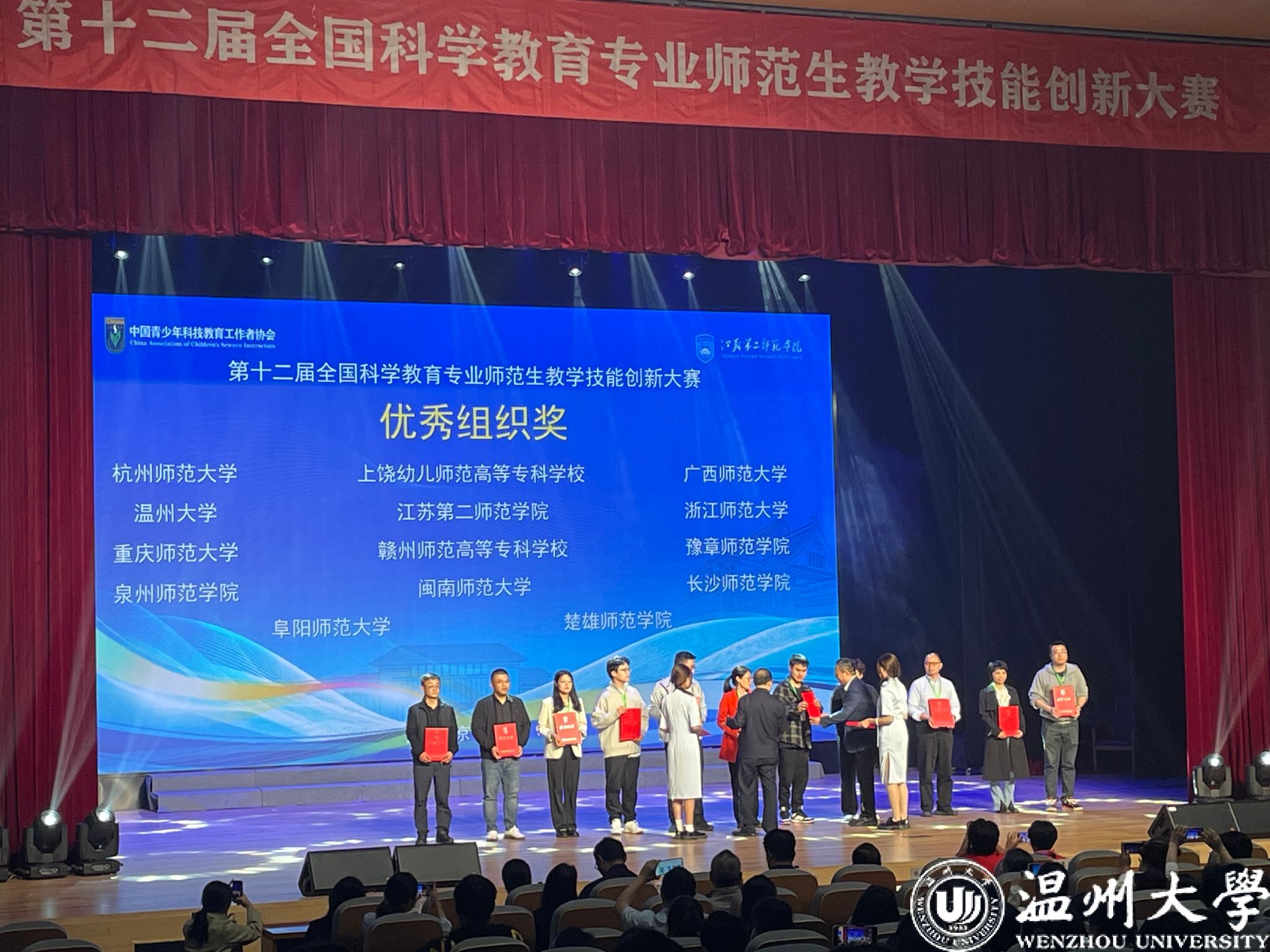 在刚刚结束的第十二届全国科学教育专业师范生教学技能创新大赛中,我校共有24名选手参加决赛,共获得7个一等奖、8个二等奖、9个三等奖,获奖数居全国参赛院校第二,一等奖获奖人数居全国参赛院校第三。赛会共评出4个创新奖,我校小学教育专业的吴海涛同学荣获创新奖。我校被评为优秀组织奖。