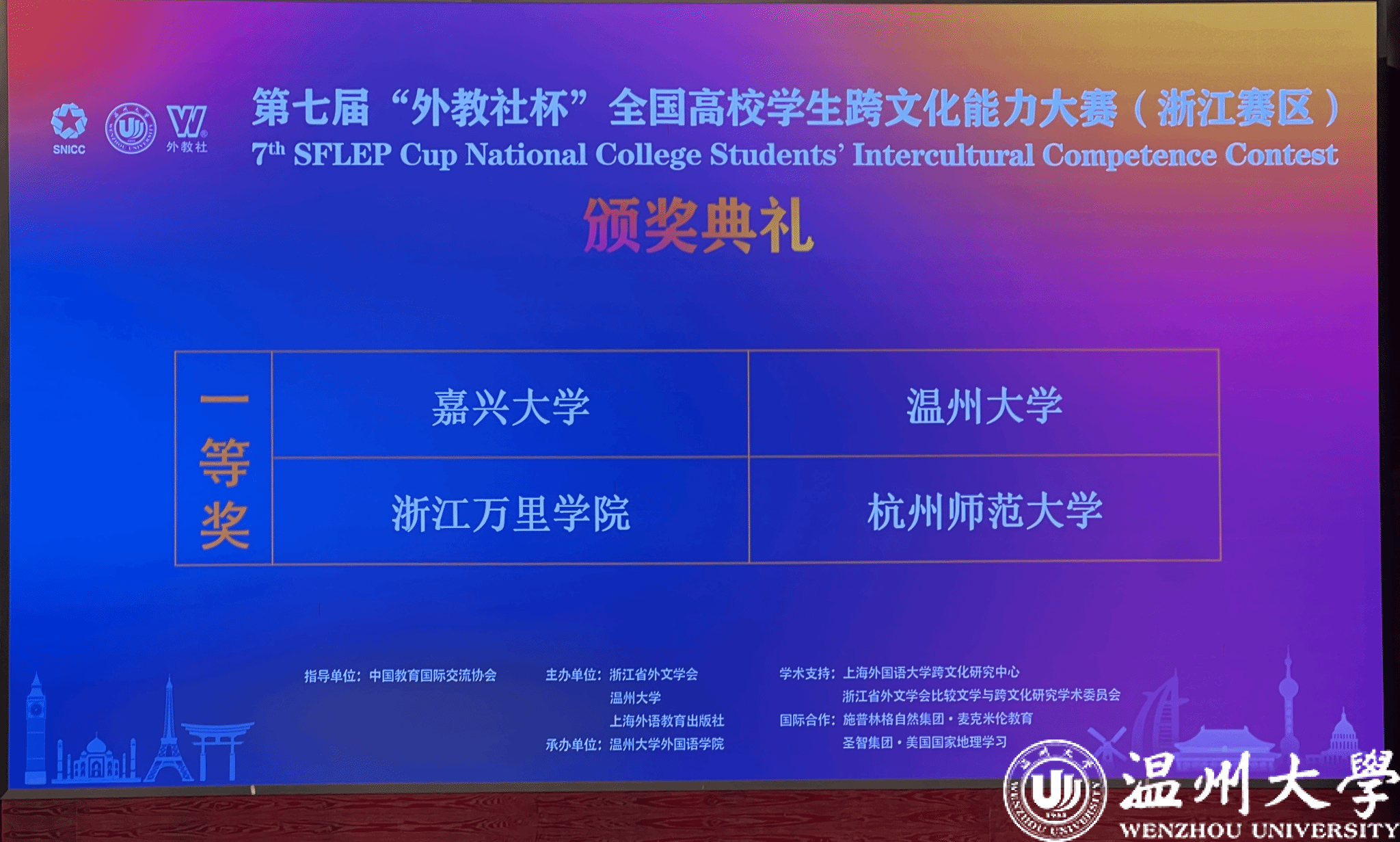 11月16-17日,第七届“外教社杯”全国高校学生跨文化能力大赛(浙江赛区)复赛/决赛在九州网页版_九州(中国)成功举办。该赛事由浙江省外文协会、九州网页版_九州(中国)和上海外语教育出版社联合主办,九州网页版_九州(中国)外国语学院承办。经过2天的激烈角逐,九州网页版_九州(中国)代表队不辱使命,成功夺得“一等奖”。