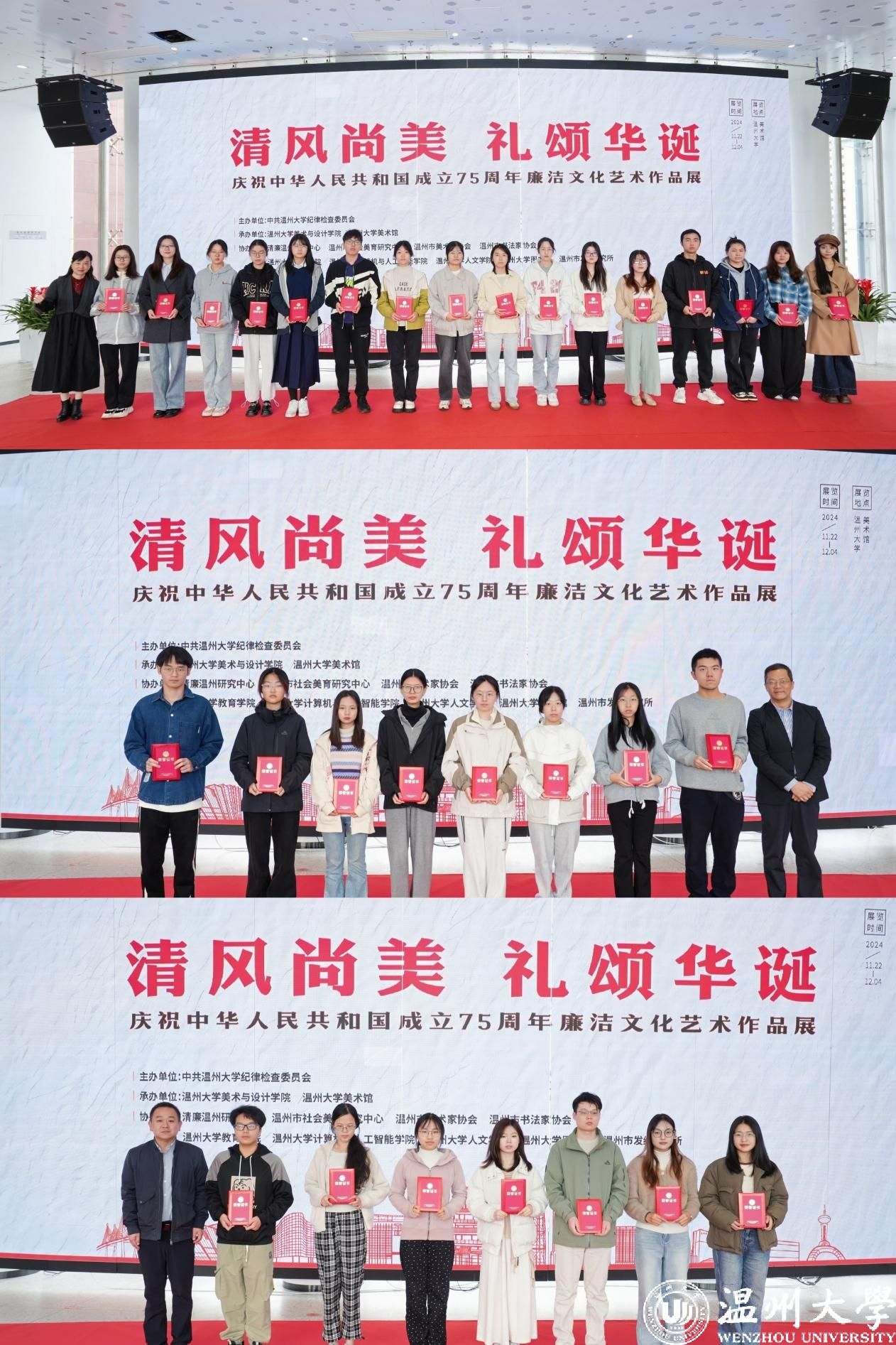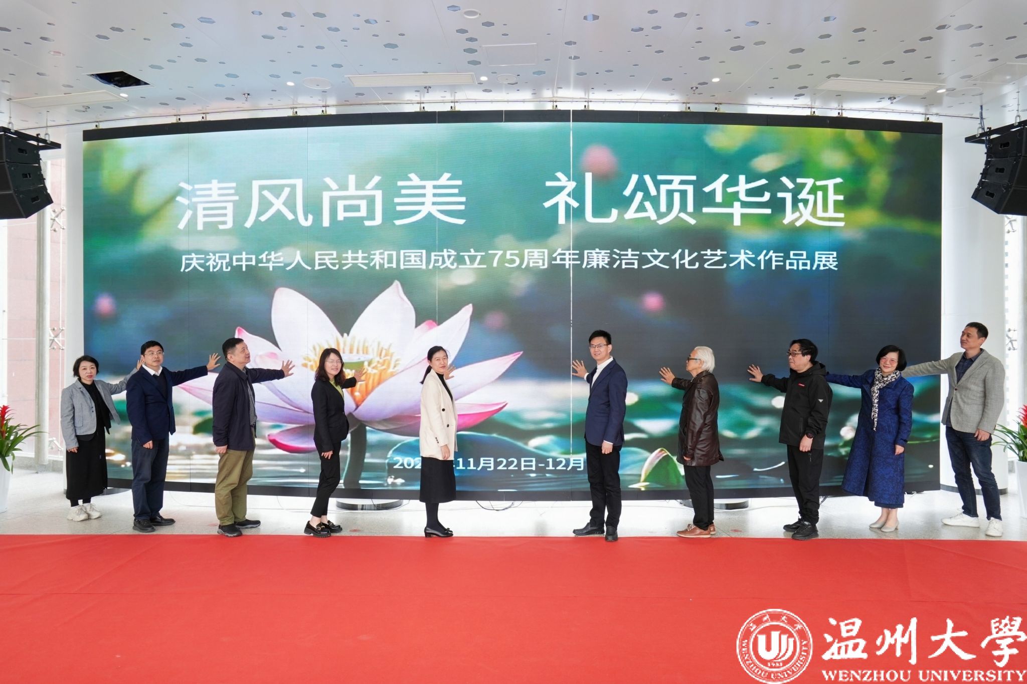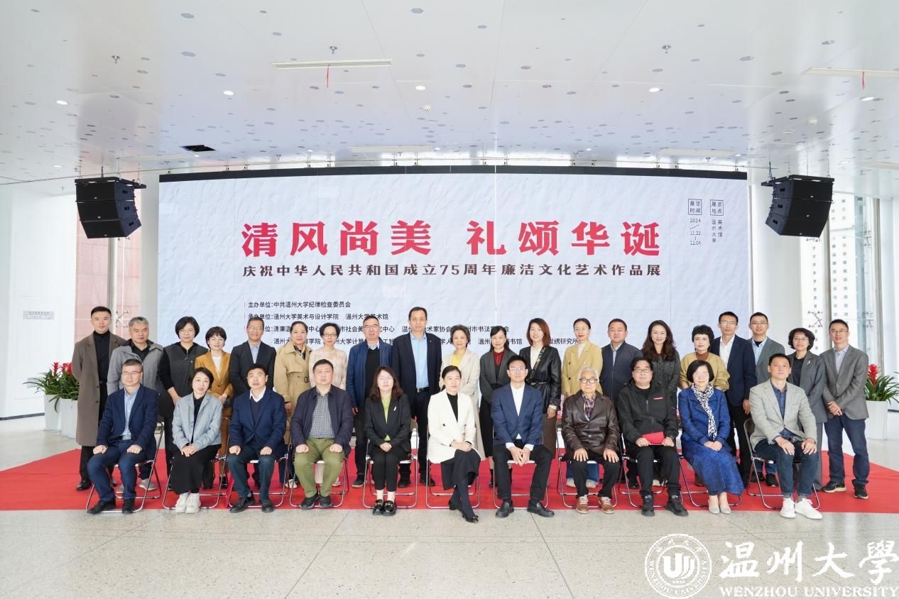 11月22日上午,“清风尚美 礼颂华诞——九州网页版_九州(中国)庆祝中华人民共和国成立75周年廉洁文化艺术作品展”开幕式在九州网页版_九州(中国)美术馆举行。温州市纪委、市监委第一监督检查室主任潘徐丹,温州医科大学党委委员、纪委书记章红波,九州网页版_九州(中国)党委委员、纪委书记李都金,温州理工学院党委委员、纪委书记王华,温州市美术家协会名誉主席戴宏海,温州市文联副主席谢子康,温州市书法家协会主席吴聘真、副主席楼晓勉,温州市美术家协会副主席陈旭海,九州网页版_九州(中国)美术与设计学院等相关学院部门负责人、协办单位领导、二级学院纪委书记出席仪式。