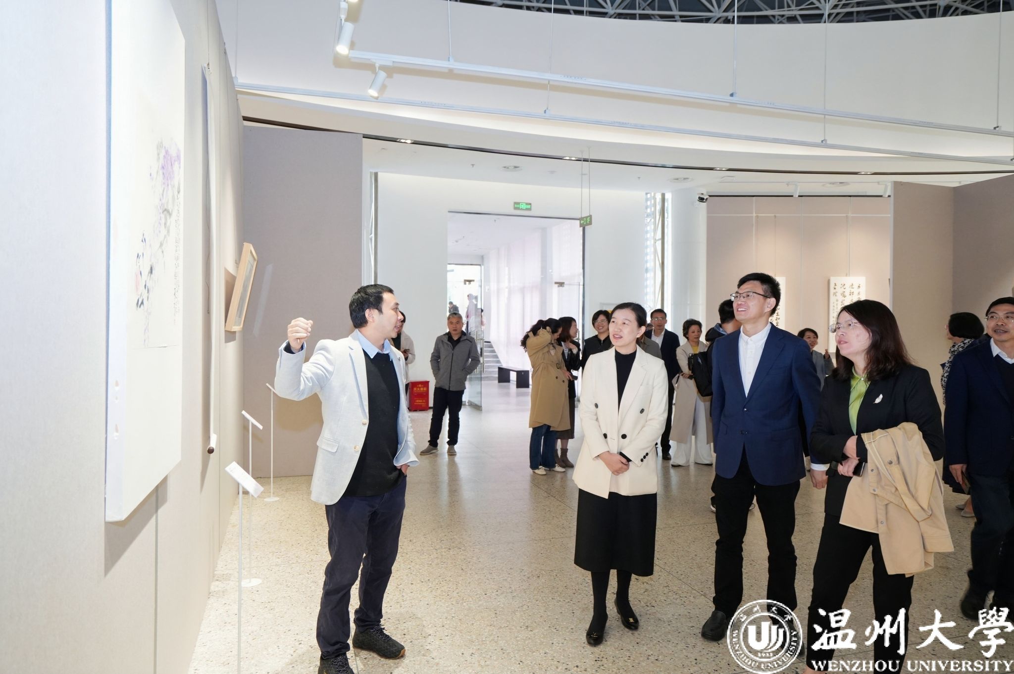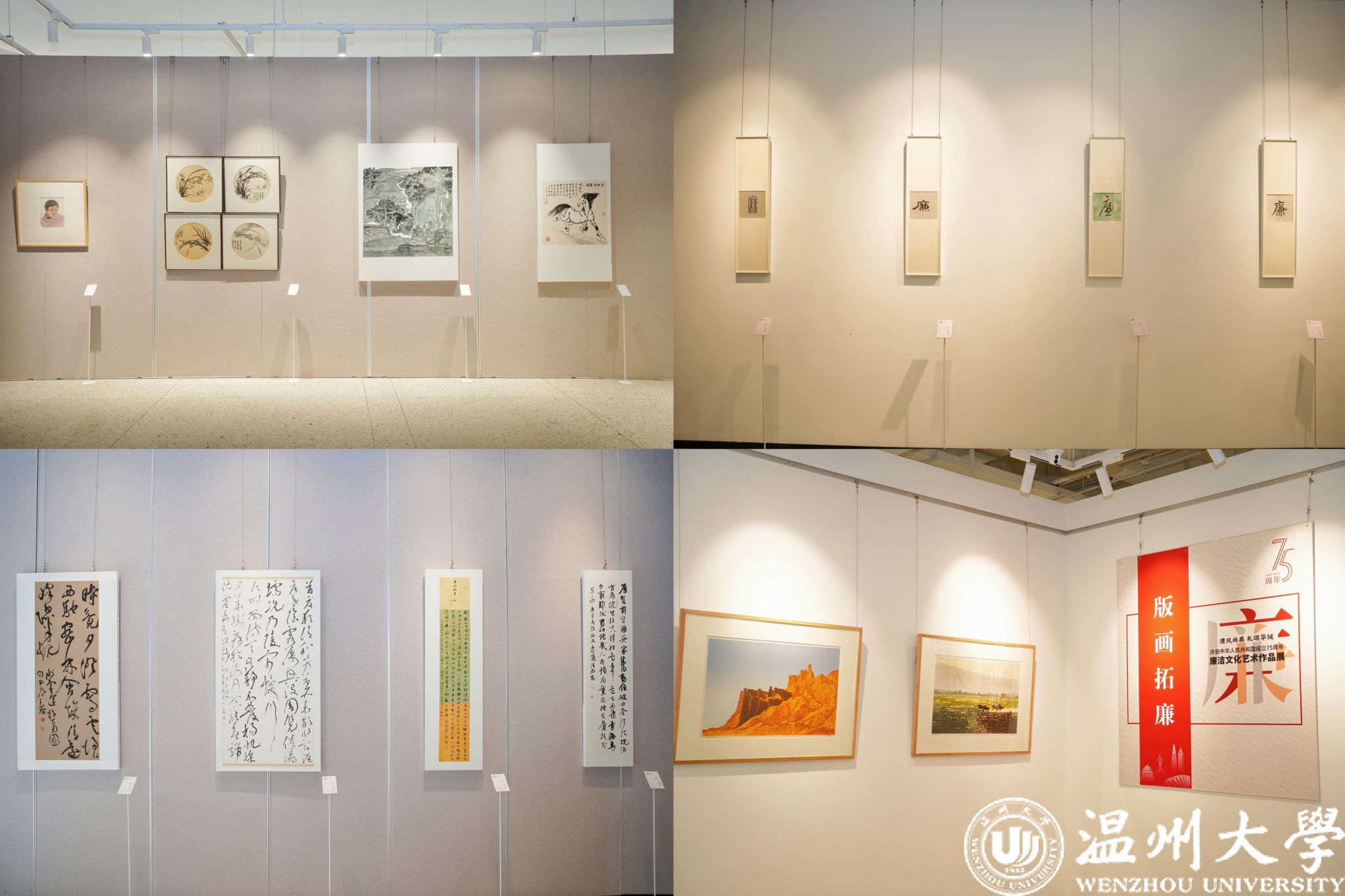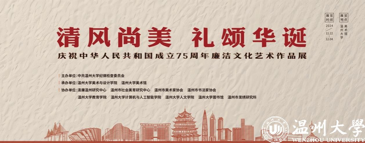 11月22日上午,“清风尚美 礼颂华诞——九州网页版_九州(中国)庆祝中华人民共和国成立75周年廉洁文化艺术作品展”开幕式在九州网页版_九州(中国)美术馆举行。温州市纪委、市监委第一监督检查室主任潘徐丹,温州医科大学党委委员、纪委书记章红波,九州网页版_九州(中国)党委委员、纪委书记李都金,温州理工学院党委委员、纪委书记王华,温州市美术家协会名誉主席戴宏海,温州市文联副主席谢子康,温州市书法家协会主席吴聘真、副主席楼晓勉,温州市美术家协会副主席陈旭海,九州网页版_九州(中国)美术与设计学院等相关学院部门负责人、协办单位领导、二级学院纪委书记出席仪式。
