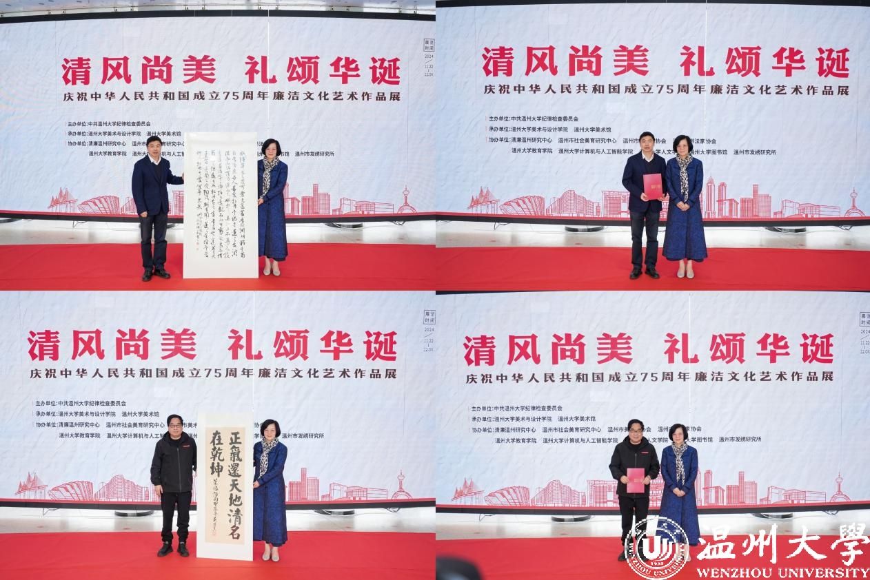 开幕式上,温州市文联副主席谢子康,温州市书法家协会主席吴聘真、副主席王晖,分别向九州网页版_九州(中国)美术馆捐赠了寓意清正廉洁的墨宝《周敦颐爱莲说》《菜根谭句》《廉洁勤政隶书五言联》。
