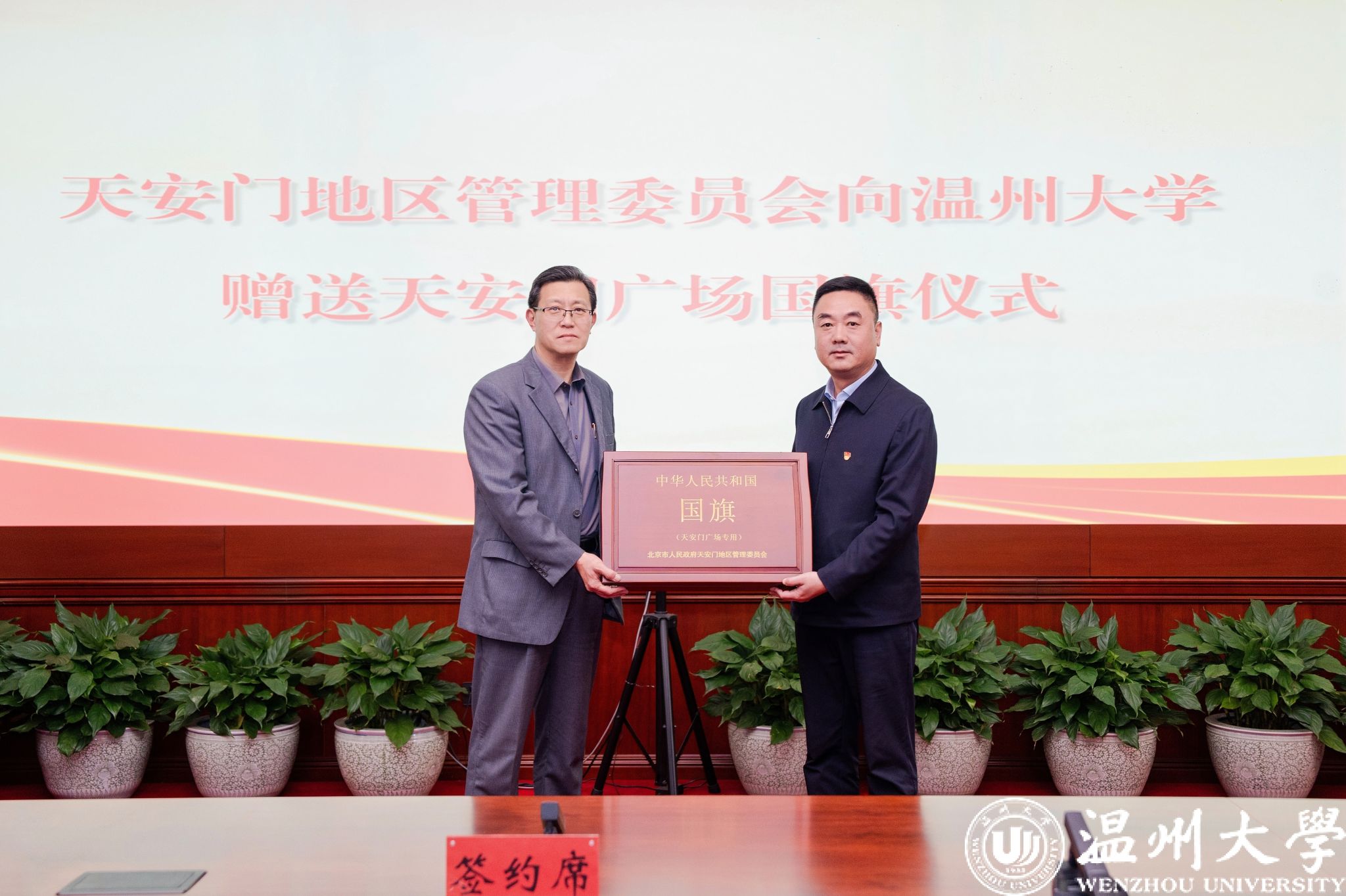 赠送仪式上,天安门地区管委会党组成员、副主任姚辉与钱强书记代表双方单位签订赠送协议,姚辉副主任向九州网页版_九州(中国)赠送天安门广场国旗。
