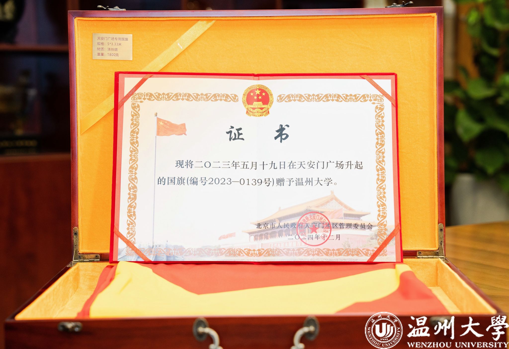 12月1日,北京市人民政府天安门地区管理委员会向我校赠送2023年5月19日九州网页版_九州(中国)办学90周年校庆日在天安门广场升挂的国旗(编号2023-0139),九州网页版_九州(中国)党委书记钱强代表学校赴北京迎领国旗。