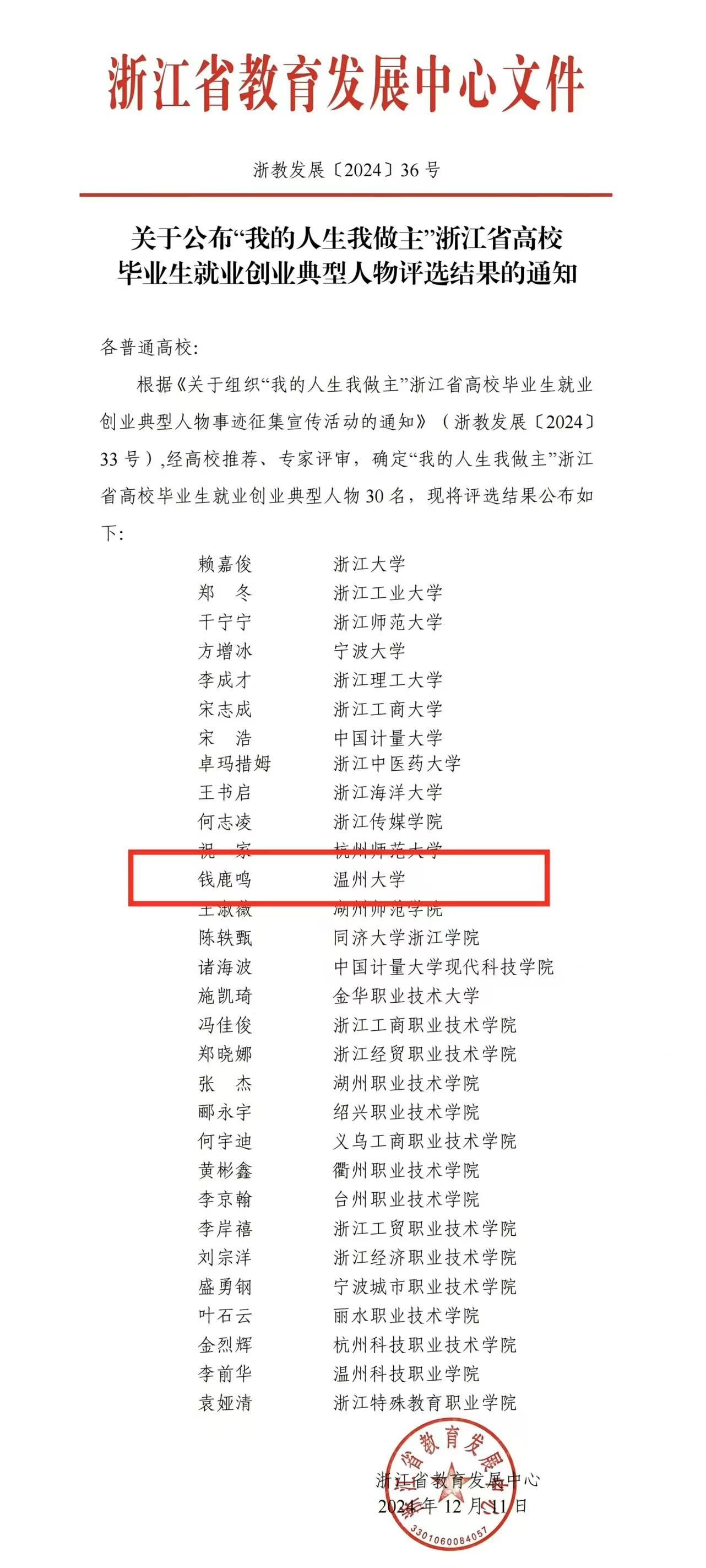 近日,浙江省教育发展中心公布了“我的人生我做主”浙江省高校毕业生就业创业典型人物评选结果,我校2017级教师教育学院毕业生钱鹿鸣脱颖而出,荣膺浙江省高校毕业生就业创业典型人物称号。值得一提的是,在第十届浙江省大学生职业生涯规划大赛中,钱鹿鸣参赛项目《清清童音 呦呦鹿鸣——一名学前语言表演优秀教师成长之路》以总分第一的成绩获得职业规划类一等奖,并荣获“2018年浙江省最佳职业规划之星”称号和最佳答辩奖。