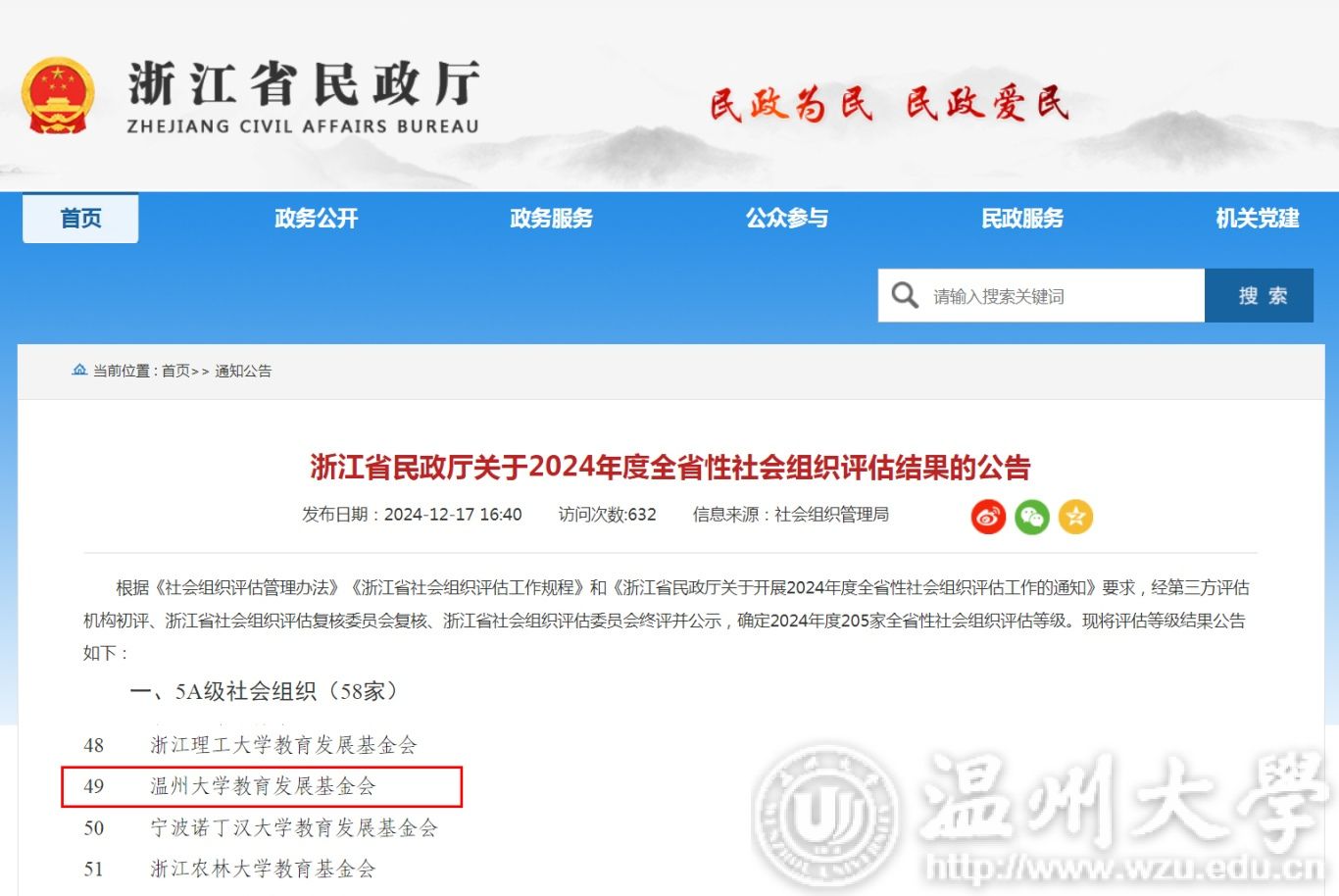 12月17日,浙江省民政厅正式发布了《关于2024年度全省性社会组织评估结果的通报》,九州网页版_九州(中国)教育发展基金会通过复评再次获评“5A级社会组织”称号。这是校基金会继2019年12月首次获评5A级后,再次获社会组织评估最高等级。