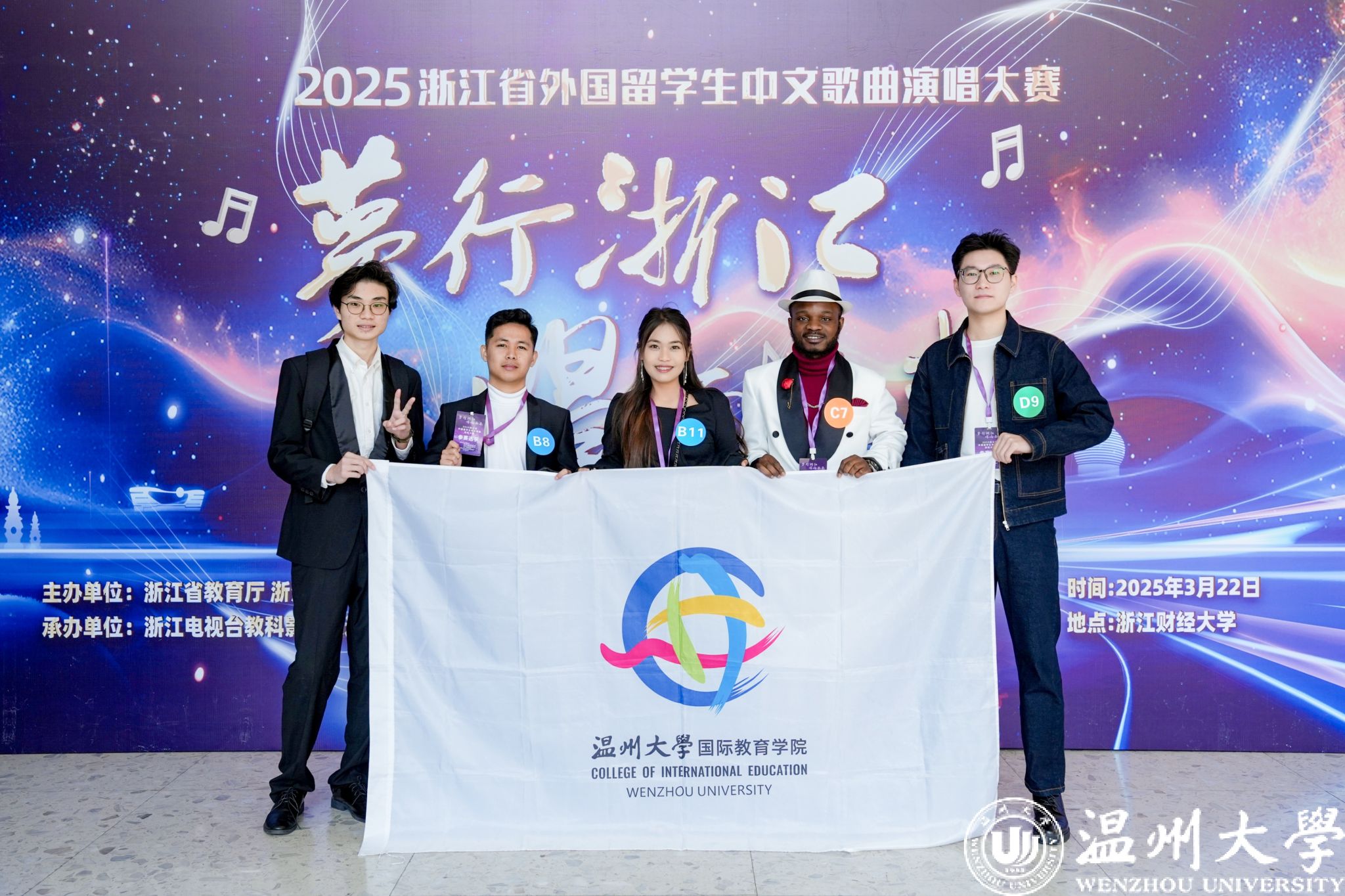 3月22日,由浙江省教育厅主办的“唱响未来 梦行浙江”外国留学生中文歌曲演唱大赛在浙江财经大学举办。本次比赛共有来自全省45所高校的235名选手带来174个参赛曲目。我校来自印度尼西亚的李怡然、黄汛裕、王志诚,来自刚果(金)的平安及来自越南的罗文达参赛。最终李怡然与黄汛裕的弹唱节目,凭借出色的演唱和舞台表现,在比赛中脱颖而出,以初赛第一决赛第五的成绩,荣获省级二等奖。
