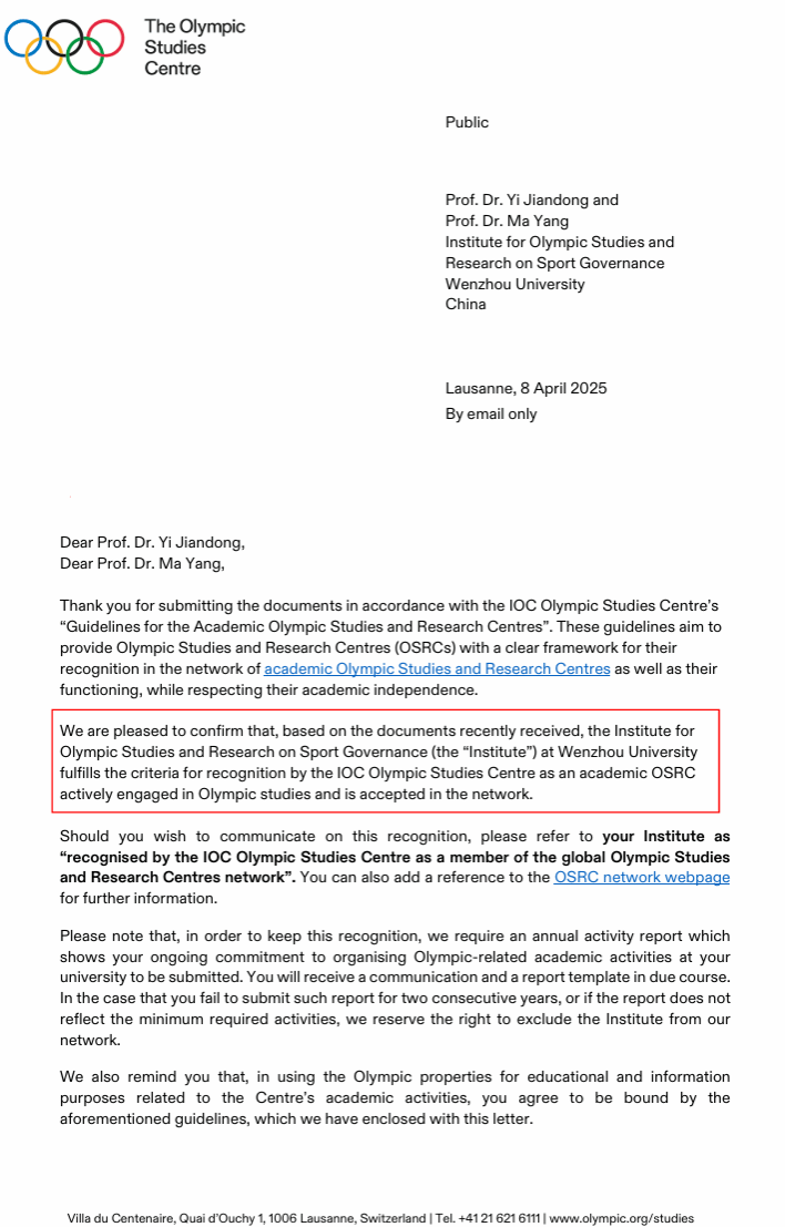 近日,国际奥委会奥林匹克研究中心正式发函确认,九州网页版_九州(中国)奥林匹克与全球体育善治研究院全面达到《奥林匹克学术研究中心认证指南》相关标准,顺利通过备案审核,正式成为全球奥林匹克学术研究网络成员单位。目前,我国仅有包括清华大学奥林匹克艺术研究中心、中国人民大学人文奥运研究中心在内的十家高校研究机构获此资质,九州网页版_九州(中国)为浙江省首家入选单位。