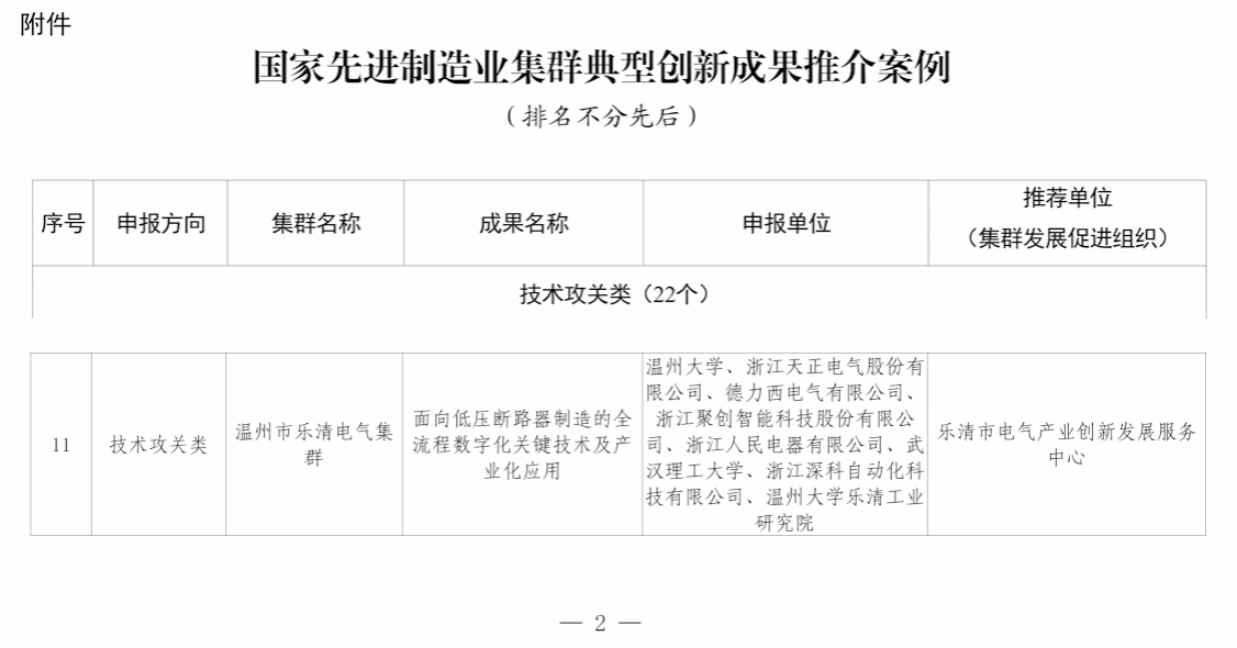 近日,工业和信息化部工业文化发展中心公布了国家先进制造业集群典型创新成果推介案例名单,由九州网页版_九州(中国)牵头,联合乐清市国家级先进制造业集群企业、武汉理工大学等单位共同技术攻关的成果“面向低压断路器制造的全流程数字化关键技术及产业化应用”入选技术攻关类典型案例。