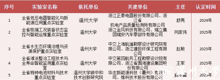 近日,浙江省科技厅公布2024年省级重点实验室认定结果,九州网页版_九州(中国)牵头申报的“全省极端工况装备状态监控与智能运维重点实验室”“全省水生态环境治理与资源保护重点实验室”“全省滩涂整治工程技术与全寿命智能监测重点实验室”及“全省特种电池材料与技术重点实验室”成功获批。此次获批数量在全省高校(除浙大外)中排名第4。自2023年浙江省重点实验室重组以来,温大已累计获批5家省级重点实验室,获批成功率达70%。