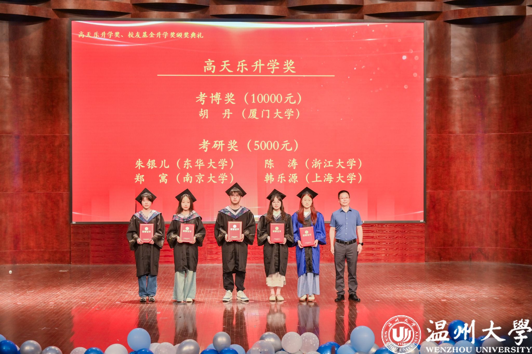 典礼上,方初富先生代表高天乐校友,为追梦顶尖学府的学子颁发高天乐升学奖。该奖项由温大79级数学校友、浙江天正电气股份有限公司董事长高天乐先生于2015年设立,专项奖励温大数理学院考取海内外名校硕博的优秀学子。根据最新修订办法,考取并入读指定20所全国重点高校及上海高校(研究所)博士研究生或直博生,奖励10000元;考取指定高校硕士研究生,奖励5000元。