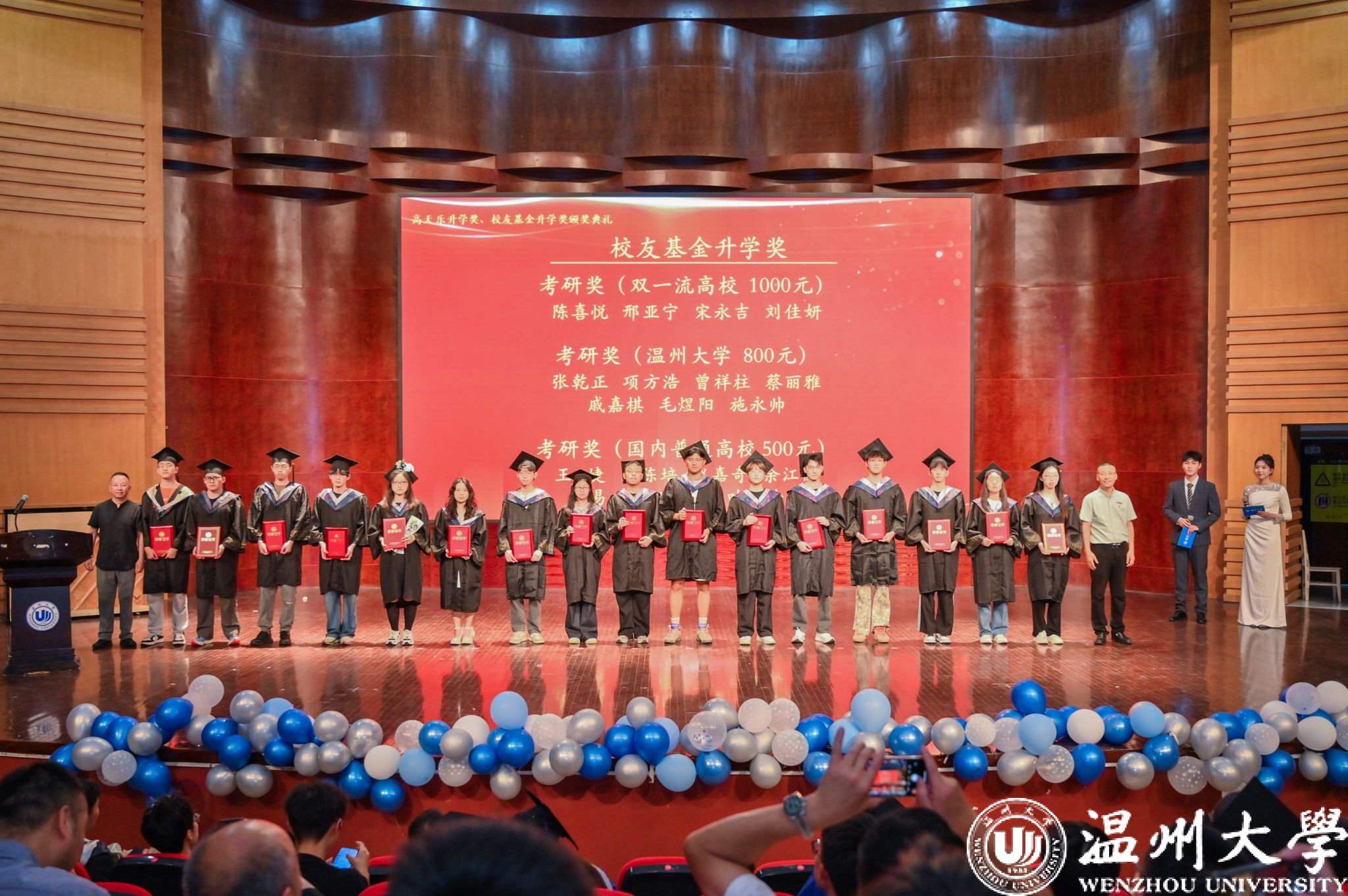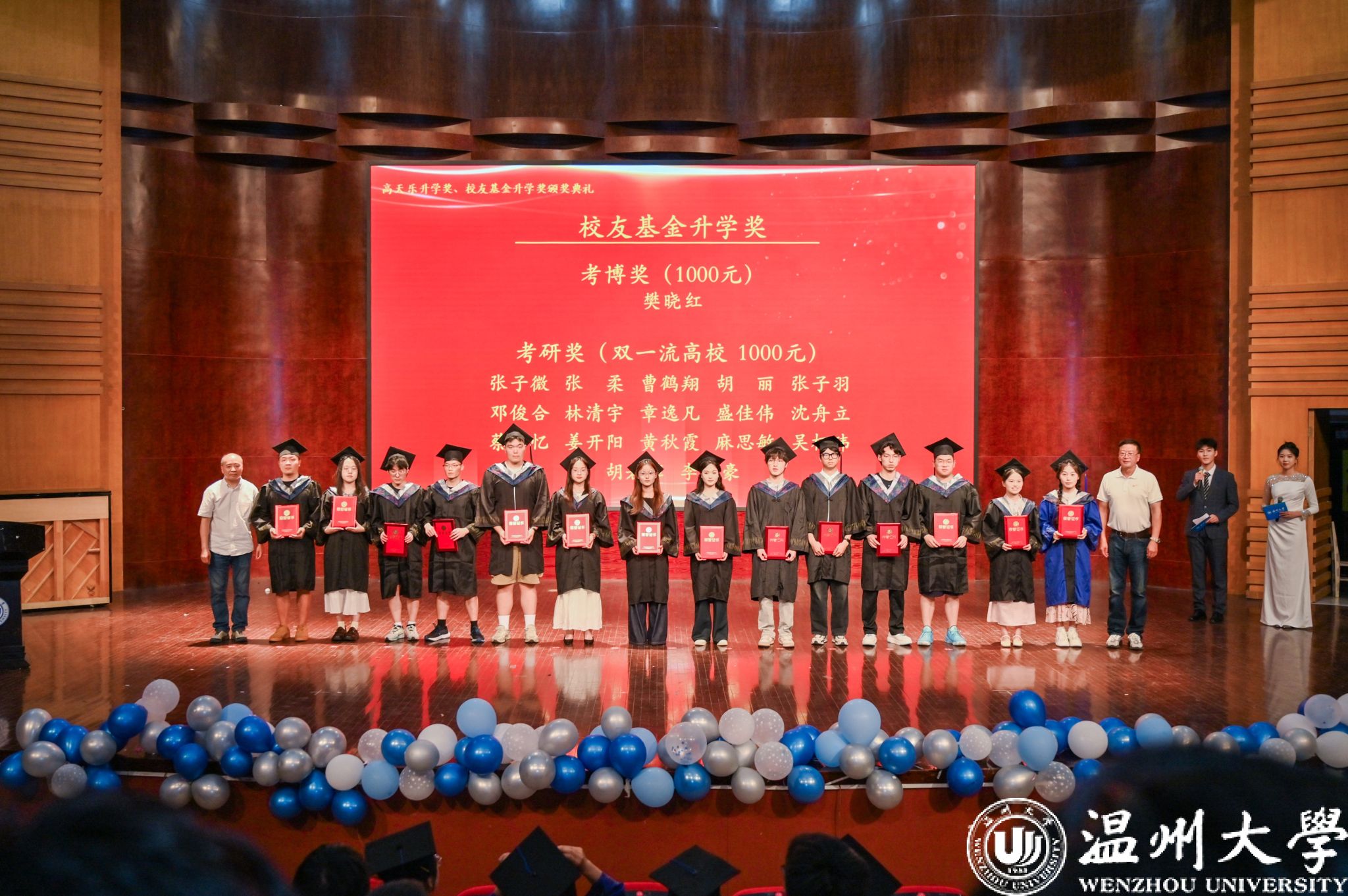 随后举行“校友基金升学奖”颁奖仪式。该升学奖是数理学院校友基金于2024年专设用于奖励成功考取国内外高校、研究机构硕博研究生的应届毕业生,旨在激励更多数理学子勇攀学术高峰。其中,考研奖:考取“双一流”高校奖励1000元,考取海外高校奖励1000元,考取温大奖励800元,考取其他普通高校奖励500元;考博奖:考取国内外高校、研究机构博士研究生的应届硕士毕业生,奖励1000元。