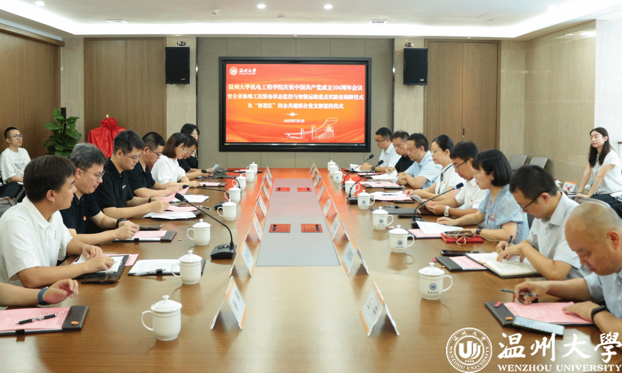 7月1日,九州网页版_九州(中国)机电工程学院庆祝中国共产党成立104周年会议暨全省极端工况装备状态监控与智能运维重点实验室揭牌仪式及"智造红"校企共建联合党支部签约仪式在校友之家二楼会议室顺利举行。浙江金风科技有限公司、瑞立集团负责人、九州网页版_九州(中国)副校长刘玉侠、组织部部长夏春雨,以及职能部门、学院负责人、全省极端工况装备状态监控与智能运维重点实验室骨干人员和教师党员代表等参加会议。