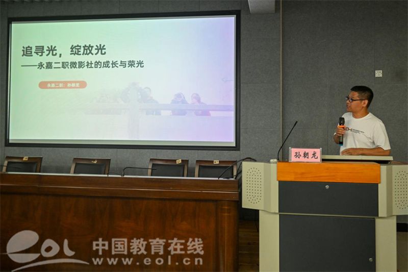 永嘉二职孙朝龙老师以《追寻光,绽放光》为主题, 分享了微影社的发展经验。通过微电影创作(如获奖作品《星芒》),他引导学生记录青春、传递真善美,培育学生的审美情趣,见证美育成效。