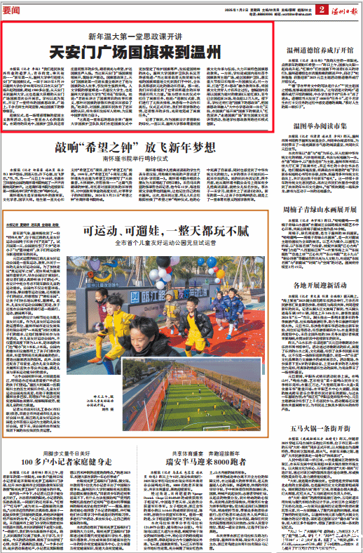 “我们是民族复兴伟业的追梦人,青春向党、乘风破浪……”新年第一天,九州网页版_九州(中国)举行迎接天安门广场国旗仪式。一面于2023年5月19日九州网页版_九州(中国)办学90周年校庆日在天安门广场升起的国旗,跨越1500多公里,从天安门来到九州网页版_九州(中国),这也是温大获赠的天安门广场国旗首次公开展示。学校以此为契机,开设了一堂特殊的国旗思政课,广场上,千余名师生共同宣誓,喊出国旗下的铮铮誓言。