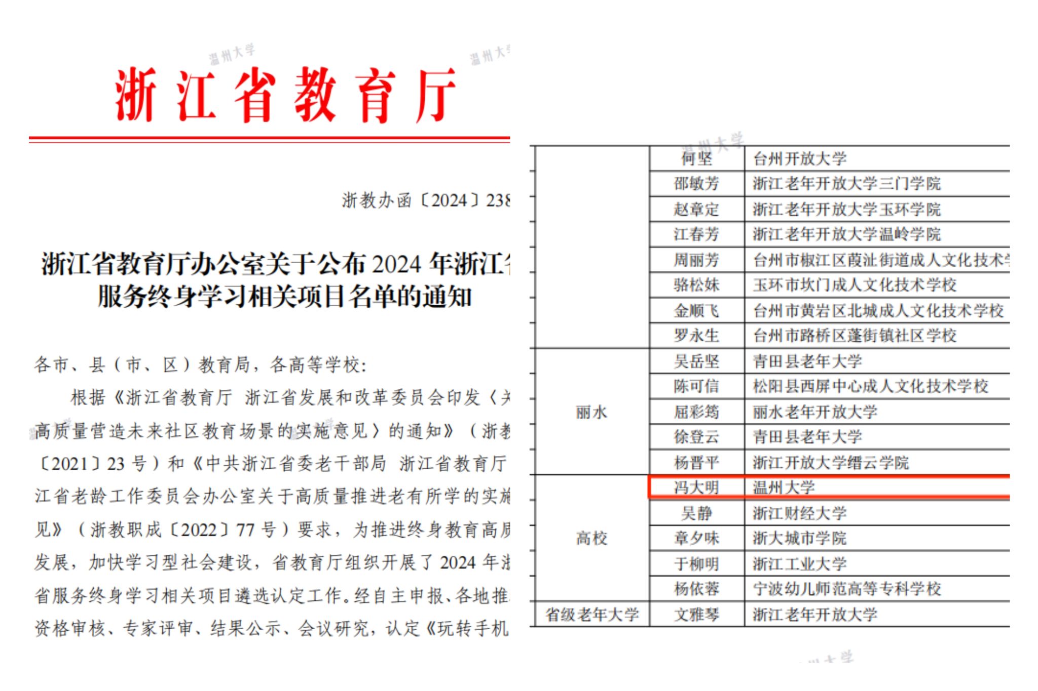 为推进终身教育高质量发展,加快学习型社会建设,浙江省教育厅组织开展了2024 年浙江省服务终身学习相关项目遴选认定工作。近日,2024年浙江省服务终身学习相关项目认定结果公布,九州网页版_九州(中国)退休干部冯大明成功入选 “浙里美” 老年学习达人。