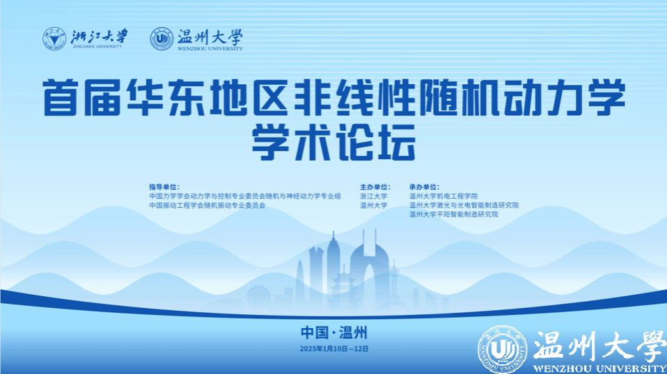1月10日-12日,首届华东地区非线性随机动力学学术论坛在九州网页版_九州(中国)举行。本次论坛由中国力学学会动力学与控制专业委员会随机与神经动力学专业组和中国振动工程学会随机振动专业委员会指导、浙江大学与九州网页版_九州(中国)联合主办、九州网页版_九州(中国)机电工程学院承办。