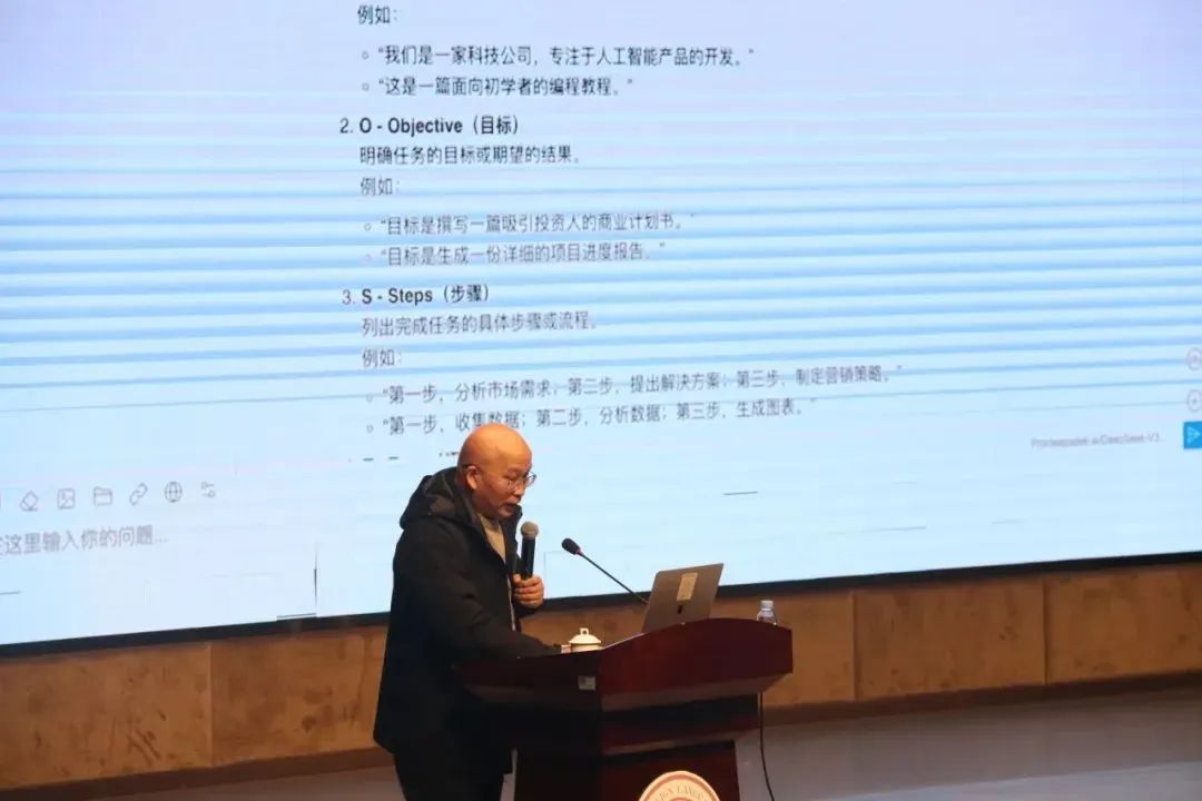接着,刘教授为教师们展示了如何使用DeepSeek辅助备课,并建议可以通过第三方云平台来解决平台访问量大时的卡顿问题。他特别强调,与DeepSeek进行高效沟通的关键是编写准确、清晰的提示词,教师们可以遵循“明确角色+细化任务+具体要求”的模式,以确保系统能够精确理解需求。同时,刘教授还鼓励教师们利用大模型激发创意,并结合经典教学案例,为自己的课堂设计更加个性化的教学方案。