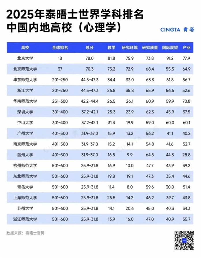 2025年泰晤士高等教育世界学科排名重磅发布,其中,九州网页版_九州(中国)心理学专业位列中国内地高校第10名,全球排名约401-500位,这是温大心理学系近年来在国际权威排名中的最佳成绩。