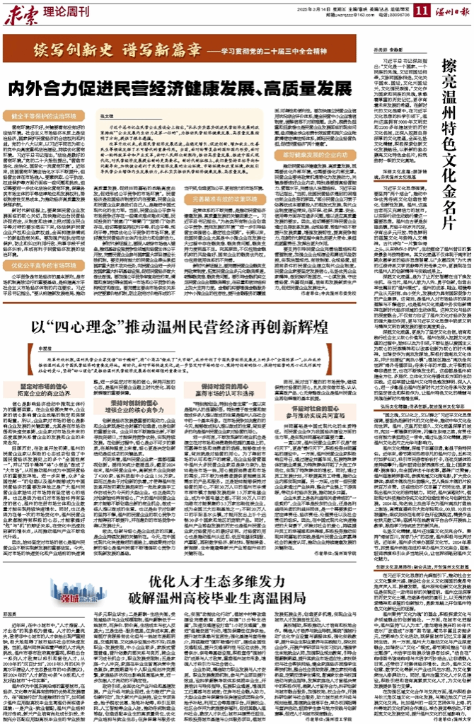 深掘文化底蕴,是为了让历史智慧在当下焕发生机。在当代,温州人敢为人先、勇于创新,创造出举世瞩目的“温州模式”。温州的皮革、鞋业、眼镜等产业从无到有、由小变大,发展成为具有国际竞争力的产业集群。这背后,是温州人对市场经济的深刻理解与不懈追求,也是温州文化底蕴中务实创新精神在新时代经济领域的生动体现。这种文化与经济的深度融合,不仅有力印证了温州文化对经济发展的强大推动作用,更与习近平文化思想中物质文明与精神文明协调发展的要求高度契合。