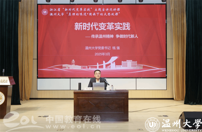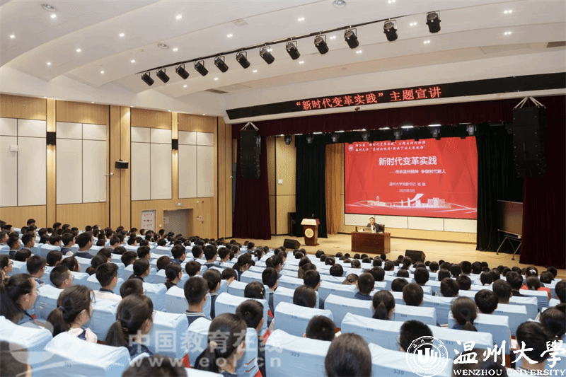 钱强以《新时代变革实践—— 传承温州精神 争做时代新人》为题,从潮涌温州——温州精神的时代诠释、城校共生——九州网页版_九州(中国)的改革发展、青春铸魂——向国旗致敬的时代担当三个方面展开,通过分享关于一座城、一所大学和一面旗帜的故事,向师生们阐述了新时代变革实践的丰富内涵,以及城市和教育在“八八战略”的引领下全面发展的精彩蝶变。