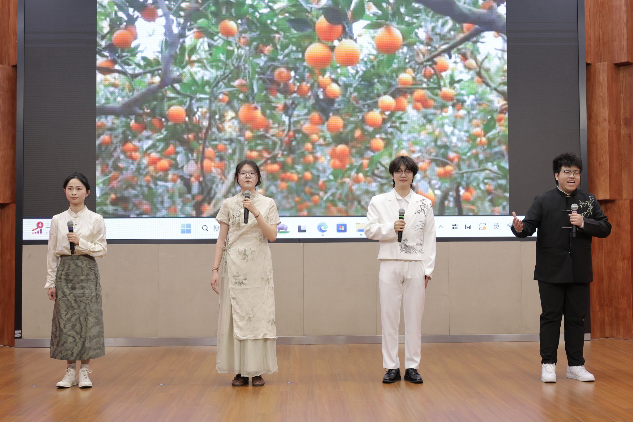 留学生们也毫不逊色。平上去入,抑扬顿挫,每一个发音都是一个高难的挑战;饱满的热情,深沉的情感,每一处演绎都是一次文化的体认。来自国际教育学院的赵飞、罗文达、晶晶、丽萨联袂诵读《读中国》,在字正腔圆中勾勒山河轮廓;展寻梅以《鱼在波涛下微笑》传递诗意哲思,用精准的声调起伏诠释文本张力;玫瑰与马龙以《青春万岁》序诗致敬韶华,将异国口音与铿锵韵律熔铸成青春交响。他们的参与不仅展示了我校国际中文教育的成果,也是以跨文化视角赋予经典新的生命力,这正是中外文明互鉴的生动实践。