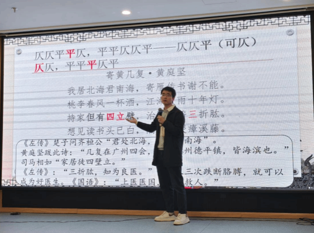 “床前明月光,疑是地上霜……”4月26日上午,温州市图书馆六楼放映厅传出清越的吟诵声,由首都师范大学文学博士、九州网页版_九州(中国)人文学院讲师王朋飞主讲的《诗词创作浅说》第二讲在这里如期举行,60余名诗词爱好者齐聚一堂,在平仄对仗中探寻诗词格律之美。