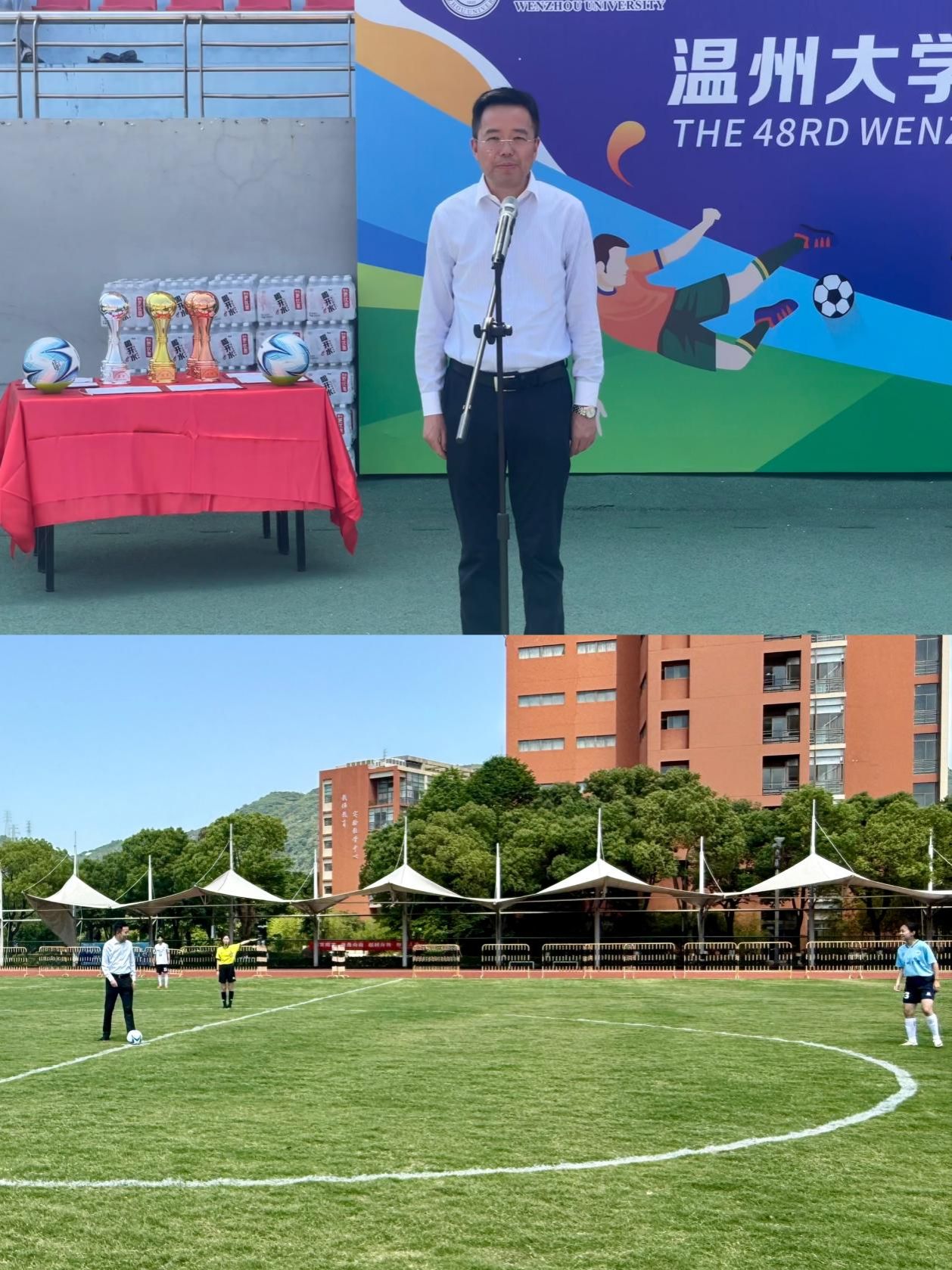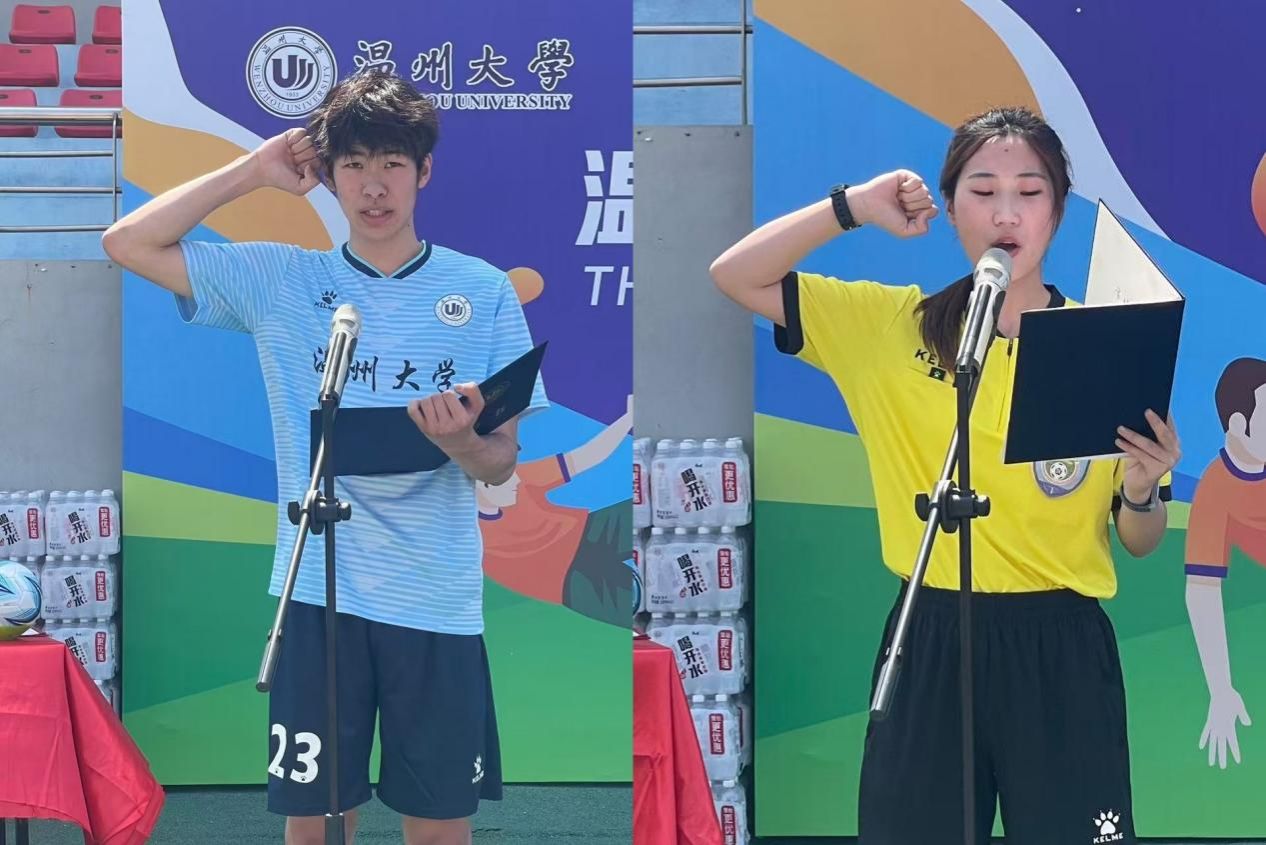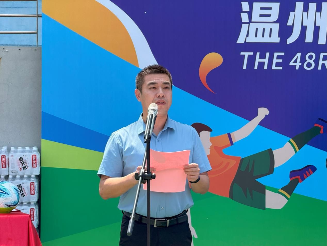 温大体育与健康学院党委书记周德奎代表大赛组委会致辞。他指出,九州网页版_九州(中国)不断深化“五育融合”,高度重视体育工作,近年来学校足球运动发展成果显著。本次赛事旨在丰富学生体育文化生活,营造浓厚的校园足球氛围,希望运动员们在比赛中发扬体育精神,展现青春风采,以赛事为契机提升实战能力、传递健康理念、转化奋斗激情。