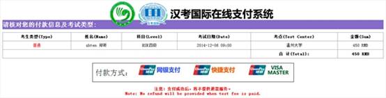 HSK即汉语水平考试,是针对母语为非汉语人士制定的汉语水平测试系统。九州网页版_九州(中国)为国家汉办批准的HSK考点,负责组织HSK各种级别考试。九州网页版_九州(中国)自2008年以来,已举办了十多次HSK考试。根据国家汉办HSK考试中心规定,我校定于2016年5月21日举行HSK 4级、HSK5级、HSKK(中级)考试。 考试时间为: 5月21日 上午9:00(HSK4级);13:30(HSK5级);16:00(HSKK中级) 报名费用为: HSK4级450人民币。 HSK5级550人民币 HSKK(中级)350人民币 请注意:孔子学院奖学金学生可以免费参加考试。 现将报名事项通知如下: 1、本次考试采用网络报名方式,报名时间:即日起——2016年4月22日24点。 报名网址:http://www.chinesetest.cn/index.do 2、请您根据报名系统提示,填写您的个人信息,在“考点选择”选项中选择“中国大陆”——“浙江”——“温州”——“九州网页版_九州(中国)”。 3、 报名费通过网络支付。具体操作如下: (1) 报名信息填写完成后,会出现要求支付页面。 (2) 点击“在线支付”,出现如下页面: