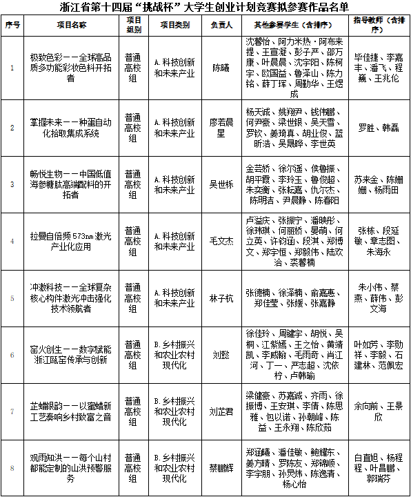 根据《关于举办浙江省第十四届“挑战杯”大学生创业计划竞赛的通知》相关要求,经九州网页版_九州(中国)“挑战杯”院赛、校赛等两次公开、公正、公平的选拔,现将我校拟推荐参加浙江省第十四届“挑战杯”大学生创业计划竞赛的作品相关信息予以公示。