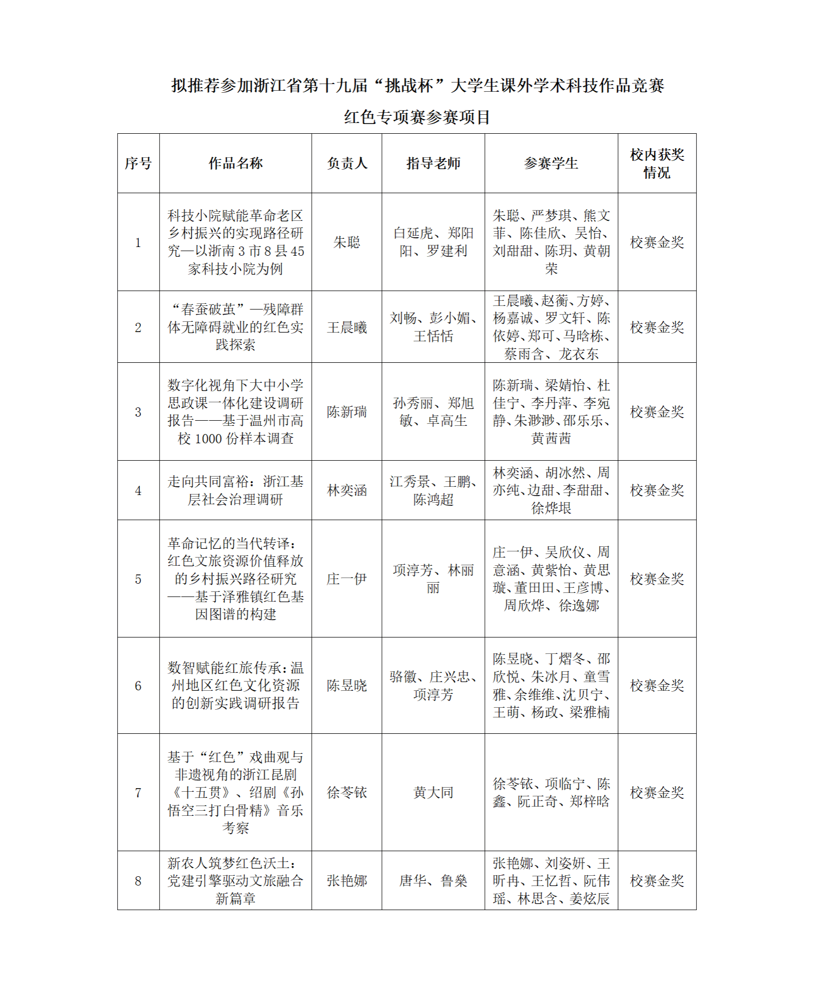 根据《关于组织开展浙江省第十九届“挑战杯”大学生课外学术科技作品竞赛红色专项赛的通知》相关要求,经学校“挑战杯”红色专项公开、公正、公平的选拔,现拟推荐《科技小院赋能革命老区乡村振兴的实现路径研究—以浙南3市8县45家科技小院为例》等8项作品代表我校参加浙江省第十九届“挑战杯”大学生课外学术科技作品竞赛红色专项赛。现将相关作品信息予以公示。