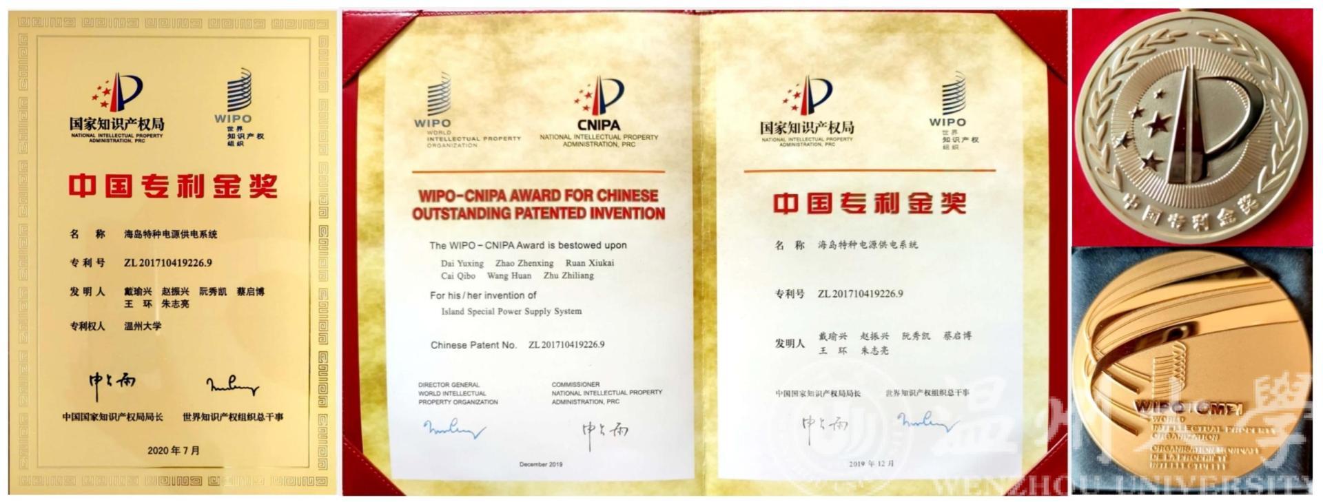 The invention patent "Island Special Power Supply System" with Wenzhou University as the patentee and Professor Dai Yuxing from the College of Electrical and Electronic Engineering as the first inventor won the 21st China Patent Gold Award for its leading technical level and remarkable economic and social benefits. It is the first time that Wenzhou University won this award.